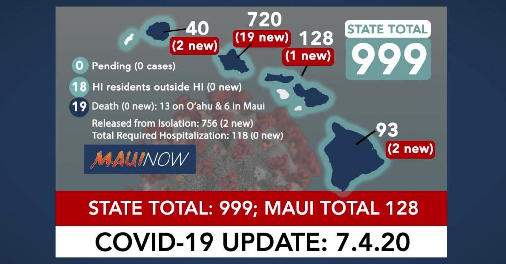 There are 24 new COVID-19 case reported for Hawaiʻi today–19 on the island of Oʻahu, two each on the Big Island of Hawaiʻi and Kauaʻi, and one on Maui–bringing the statewide count to 999 cases in Hawaiʻi over the course of the pandemic.