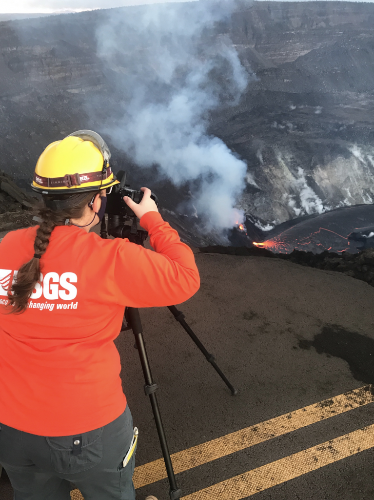 HVO scientists monitor the ongoing Kīlauea summit eruption from within an area of Hawai‘i Volcanoes National Park that remains closed to the public for safety reasons. They are equipped with a range of specialized safety gear and personal protective equipment such as gas masks, helmets, gloves, and eye protection. No major changes were observed at the eruption site overnight and this morning: the west vent remains active and continues to feed the lava lake. USGS photo by L. DeSmither.