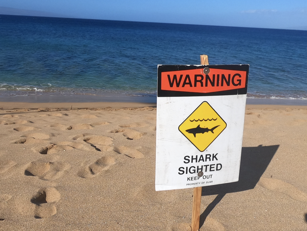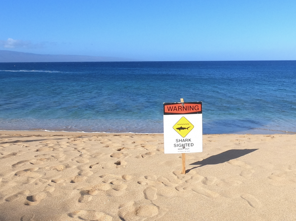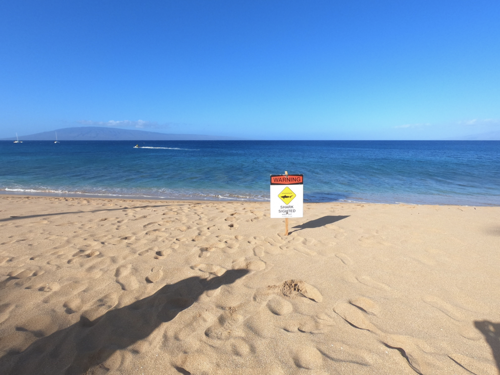 DOCARE Lt. Ron Cahill explained “long-in-place” shark-human encounter, safety protocols. For today’s incident he said, “Shark warning signs have been posted from Puʻu Kekaʻa “Black Rock” to Honokōwai Beach Park warning people to stay out of the ocean until an all-clear is given.”