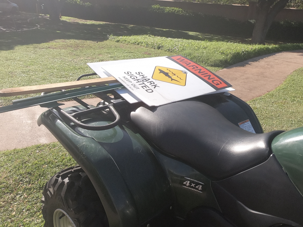DOCARE officers also arrive with signs, some of which are loaded onto an ATV to be put up along a stretch of beach, one mile on either side of the incident site. The signs themselves become photographic memories for visitors.