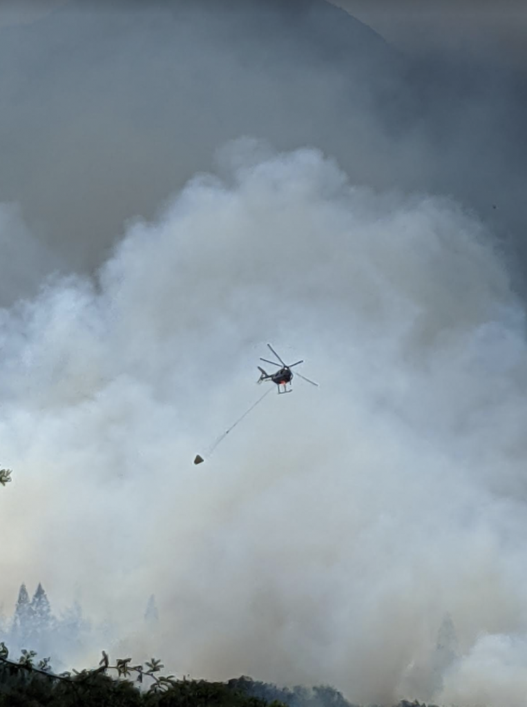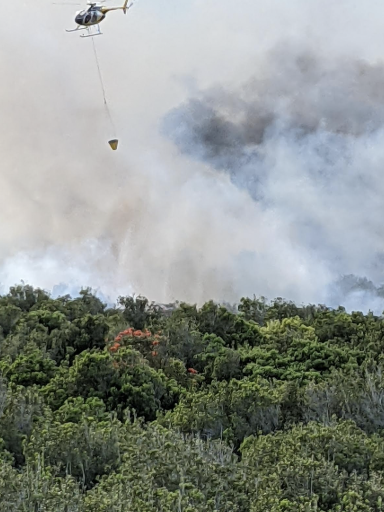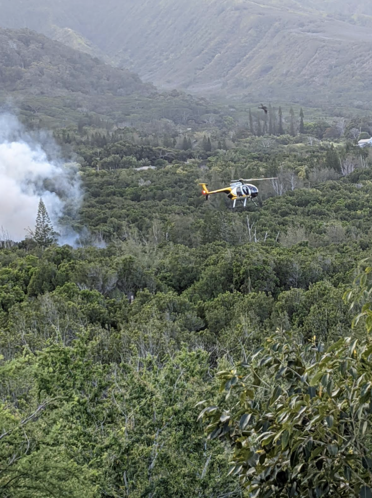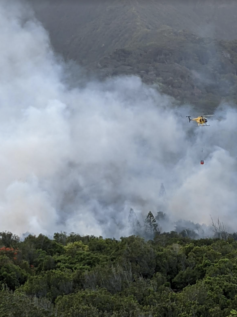 At around 4:20 p.m., witnesses said two helicopters were conducting water drops in an effort to contain the fire that appeared to be increasing in size and was advancing mauka.