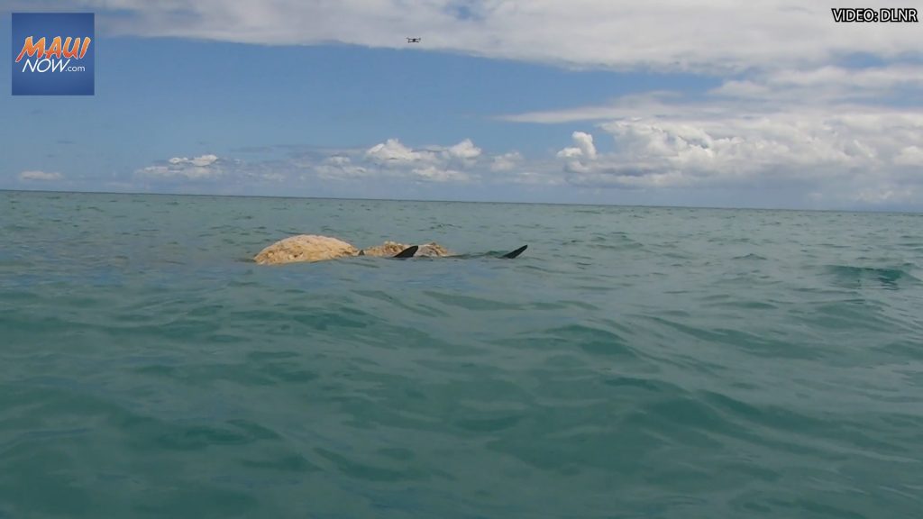 The state Department of Land and Natural Resources reports that throughout the day, the carcass seems to be drifting closer to the beach, and at one point was an estimated 100-150 yards from shore.