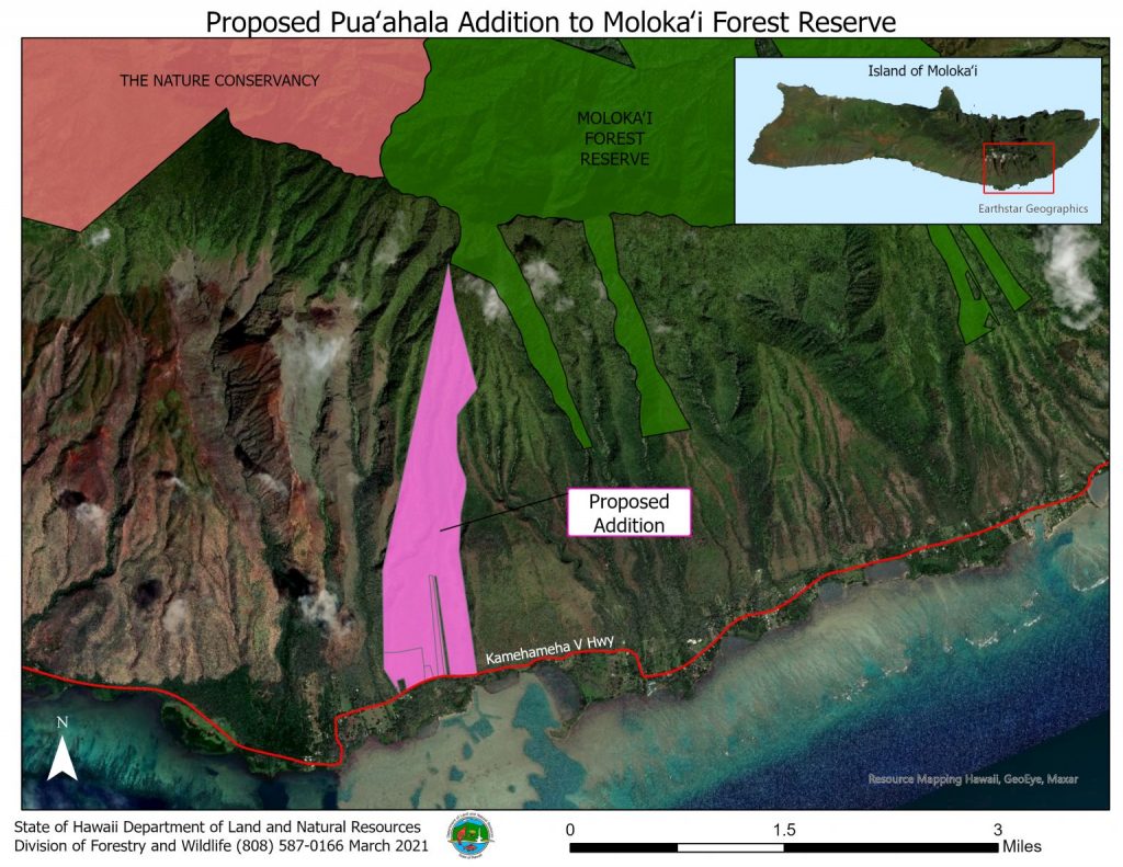 The third proposed addition is in southeast Molokaʻi and is comprised of approximately 733 acres in the ahupuaʻa of Puaʻahala. It was acquired in 2020 for addition to Molokaʻi Forest Reserve and contains some of the most pristine forests remaining in the area. This acquisition was important for completing the Pāku’i watershed protection project, part of a larger effort with community support to fence and protect vital watersheds on Molokaʻi. The area will also be valuable for creating fuel breaks and mitigating the risks of wildfires in the surrounding area.