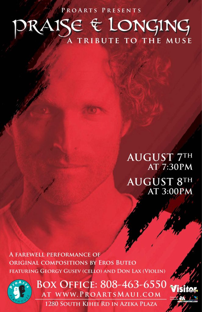 “Praise & Longing: A Tribute to the Muse” is a merging of many disciplines in celebration of both the pleasure and pain of a life performed by poet/pan-genre singer-songwriter/composer/producer Eros Buteo. The show will run Saturday, Aug. 7 at 7:30 p.m. and Sunday, Aug. 8 at 3 p.m. Tickets are $30.