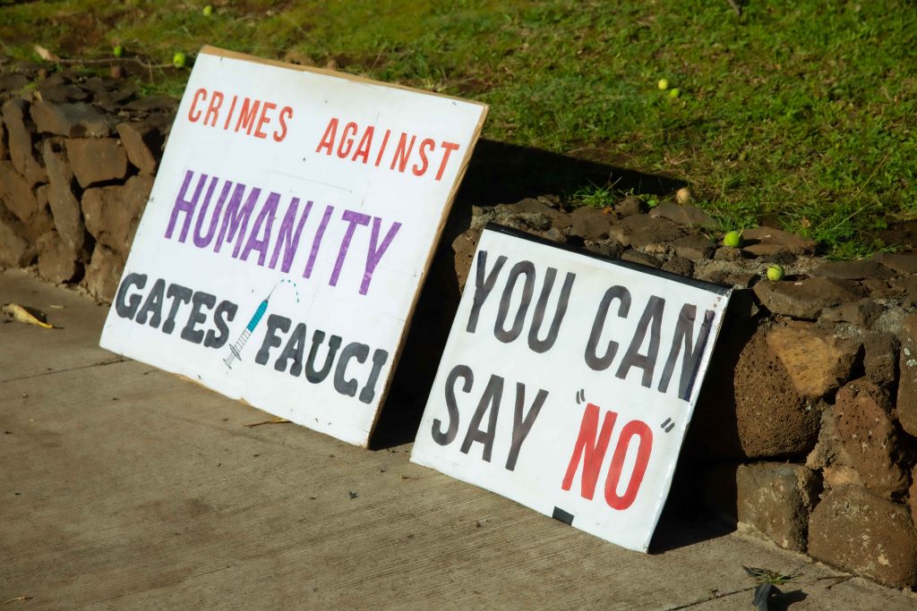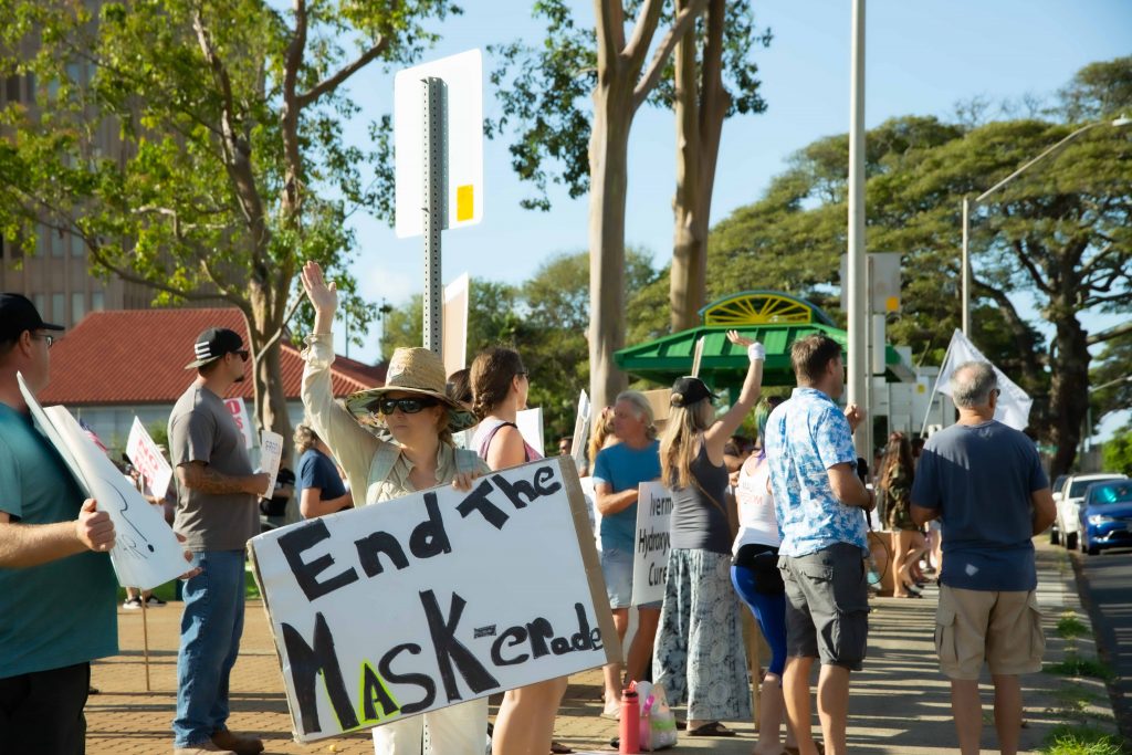The message relayed by demonstrators today remained consistent with previous events, as participants waved signs that read: “For the people, not control the people,” “Faith over fear,” “My keiki, my choice,” “End the mask-erade,” “Peaceful non-compliance,” “We stand in solidarity with our government employees,” and “We do not consent to forced vaccinations.”