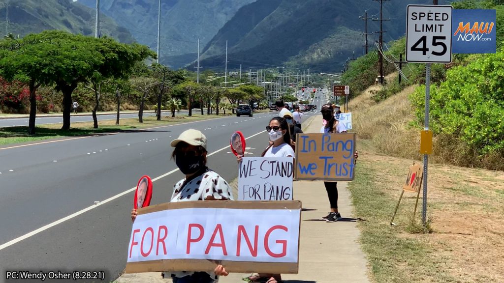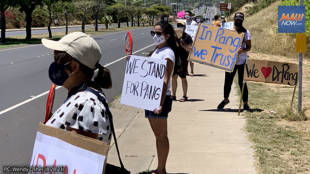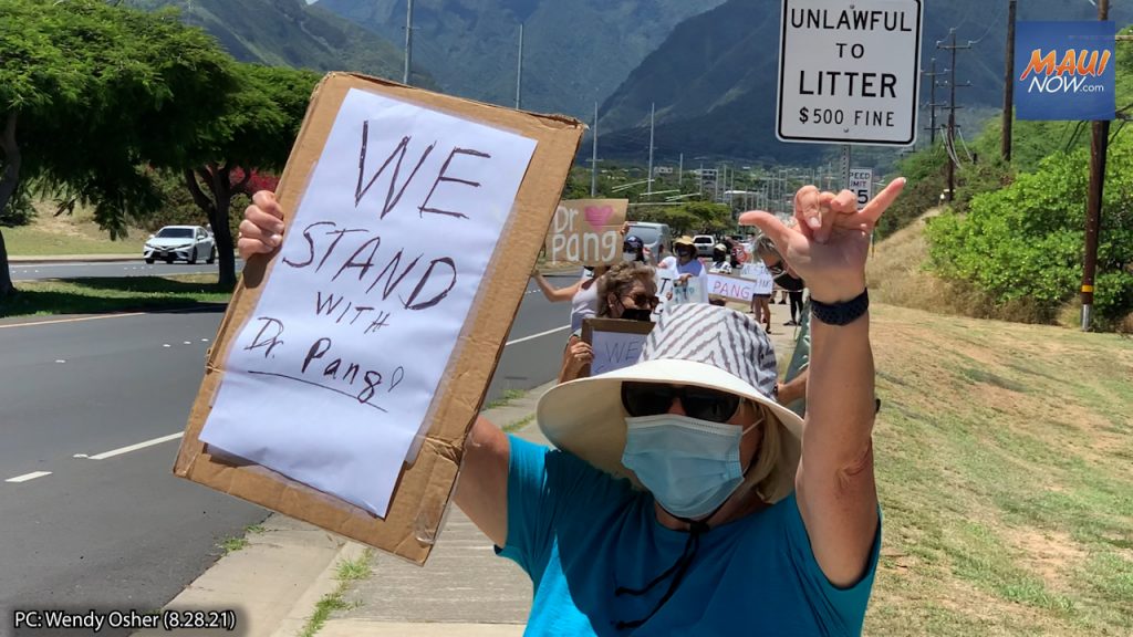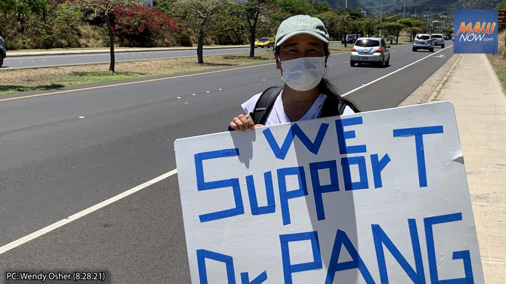 “I think the majority of us are here today because we believe in Dr. Pang and we support all of the hard work that he has done for Maui County and our community, especially lately through this pandemic,” said Kris Marcello. “Personally I feel the media may have twisted a few words around that made him appear in a negative way. I believe that that is not his stance and his purpose of joining that coalition.”