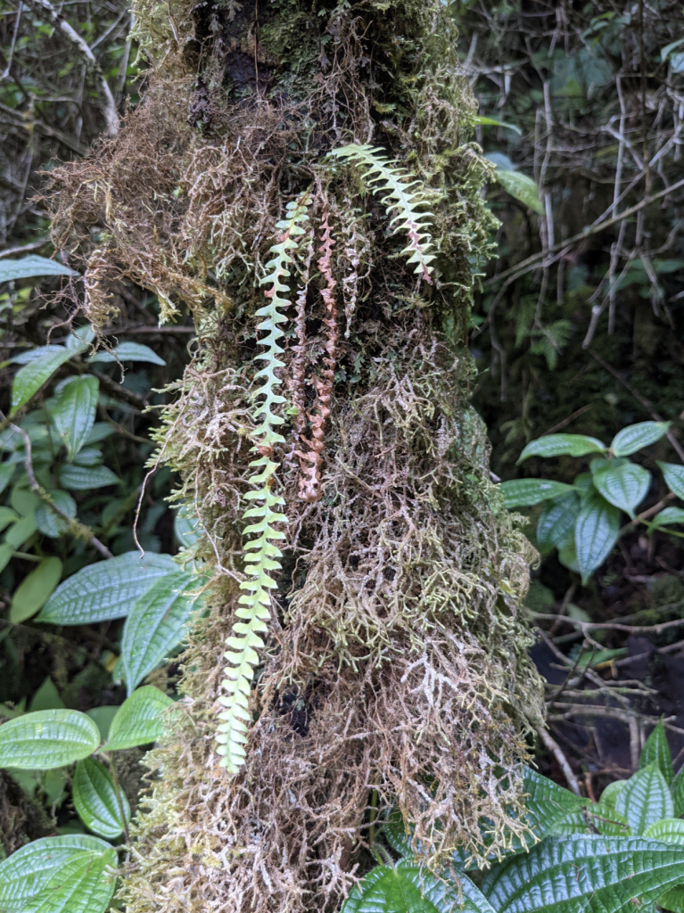 “It was really exciting to find this pendant kihi fern (Adenophorus periens), which is one of the more recent extinctions in the wild. We’re always looking for it when we’re in the field and we have GPS points where it used to be found on Kaua‘i, so when we’re in those areas we’re always scanning every tree, looking at all the ferns in the same genus. We always have our eyes out for it, so while it was in the back of our minds, I don’t think either of us were expecting to see it on a tree trunk right in front of us. It was a big surprise and extremely exciting,” said Deans.