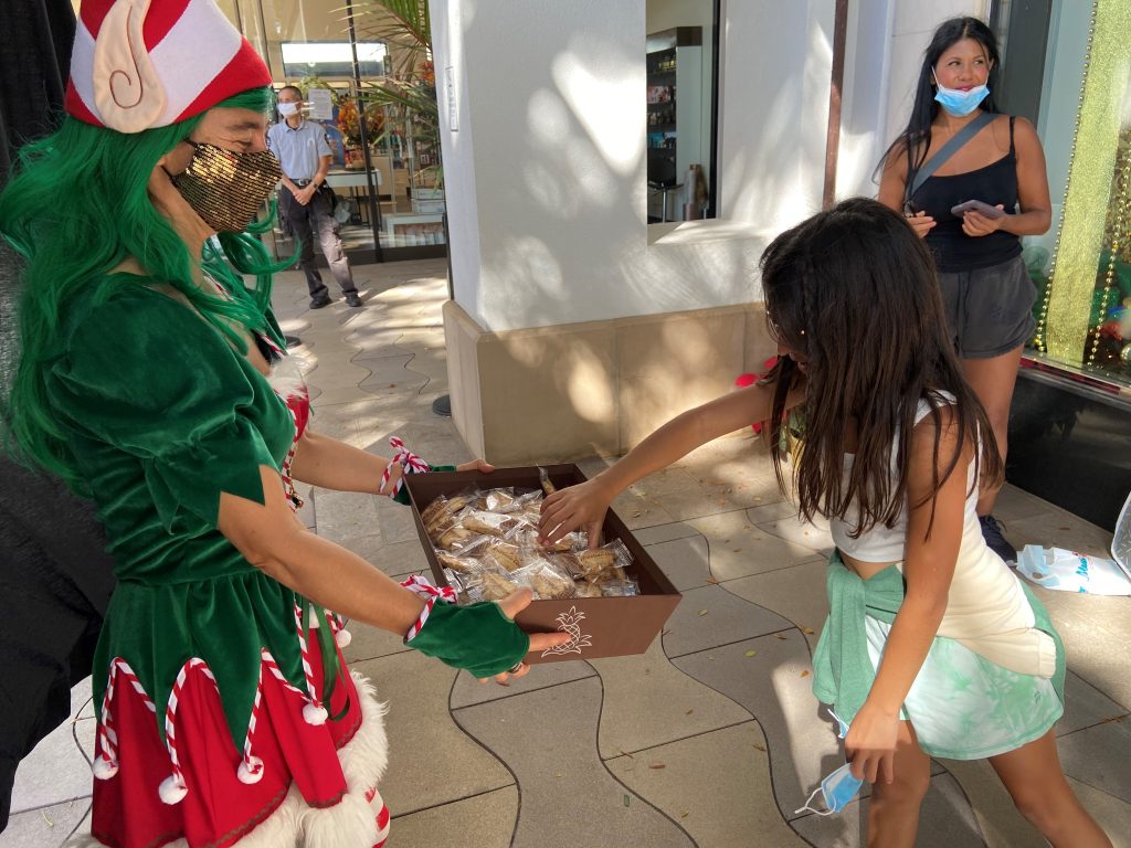 For safety, Santa sat behind a storefront window while guests snapped photos with him at the Window Wonderland. Santa’s elf handed out Peppermint Macadamia Nut Cookies from Honolulu Cookie Company.