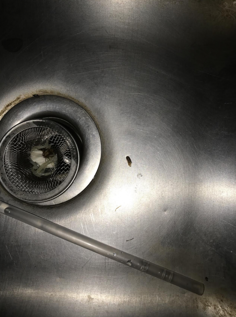 - Numerous live adult and juvenile cockroaches throughout the kitchen and bar. Cockroaches were observed crawling on various food contact surfaces and a cockroach egg case was also observed within the bar handwash sink.