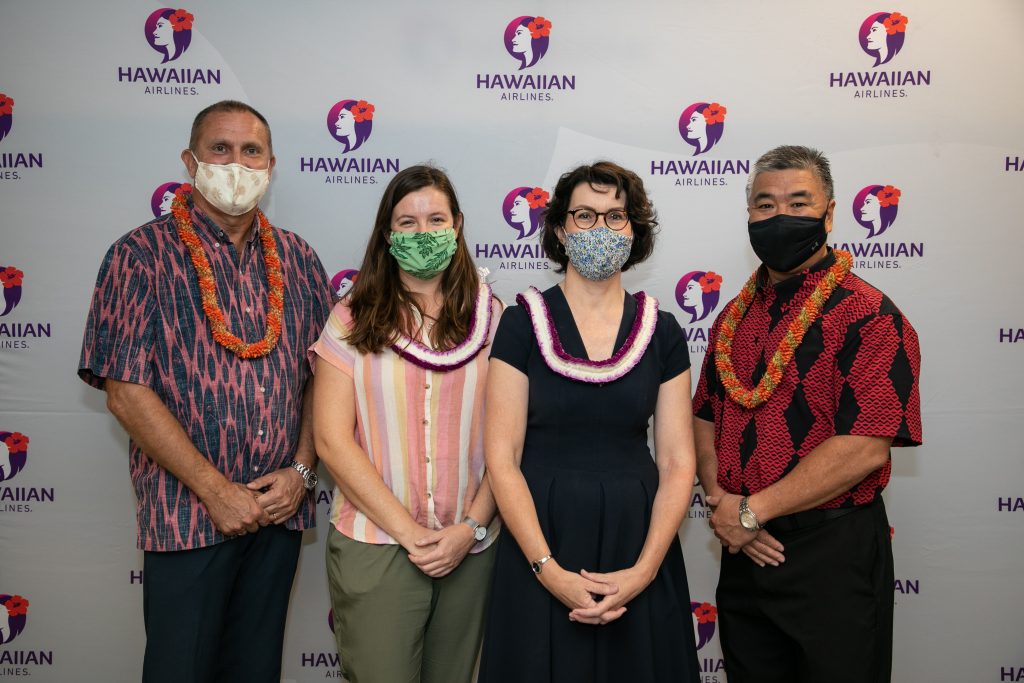 (L to R) Jon Snook, executive vice president and chief operating officer, Hawaiian Airlines; Belle Rudge, Consular Officer of Australian Consulate-General, Honolulu; Andrea Gleason, Consul-General of Australian Consulate-General, Honolulu; Ross Higashi, deputy director for the Department of Transportation, Airports Division. PC: Hawaiian Airlines.