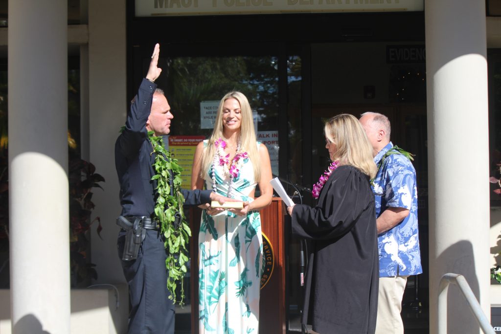 New Maui Police Chief, John Pelletier was sworn in alongside new Deputy Police Chief Charles Hank III during a blessing and badge pinning ceremony held this morning at the Wailuku Police Station.