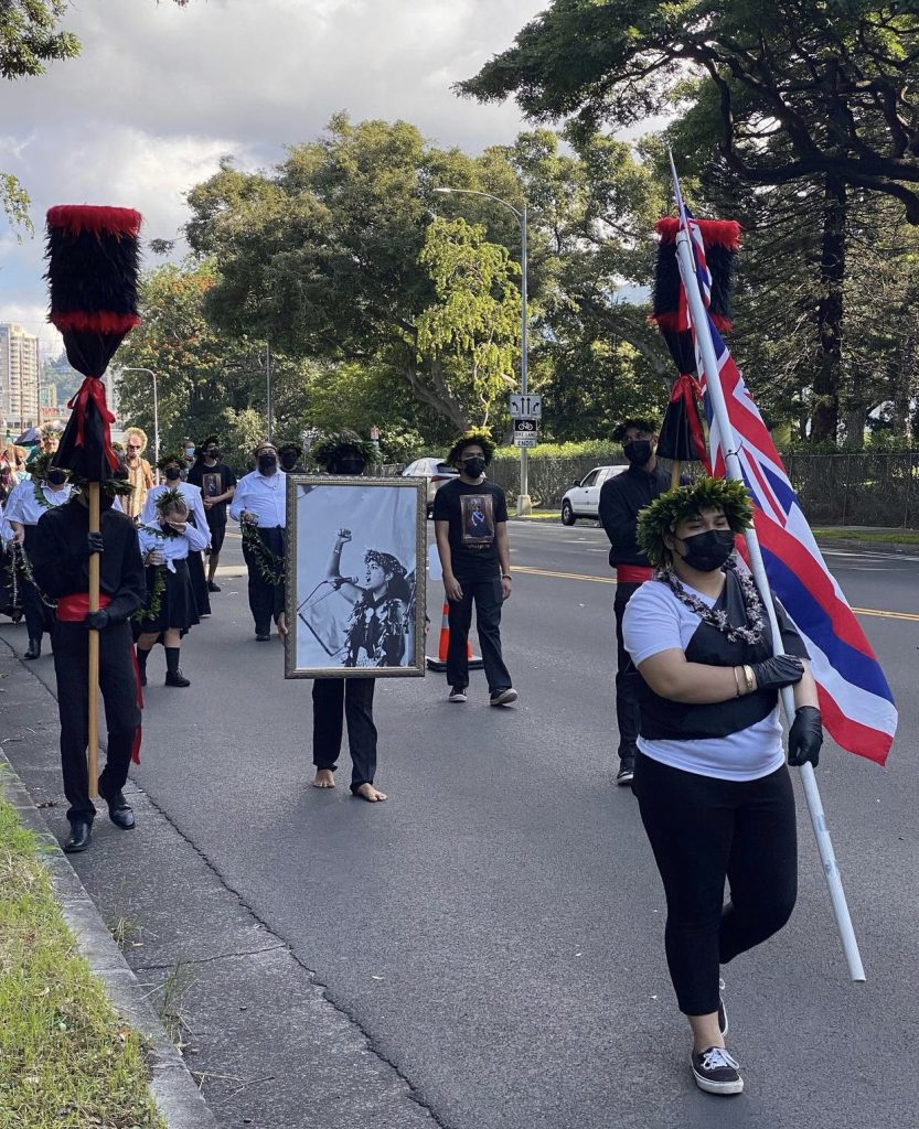 The Queen’s Court proceeded from Maunaʻala (the Royal Mausoleum) in Nuʻuanu valley to ʻIolani Palace. The Peace March was followed by protocol at Queen Liliʻuokalani’s statue and a gathering that included speeches from Kanaka Maoli leaders and music.