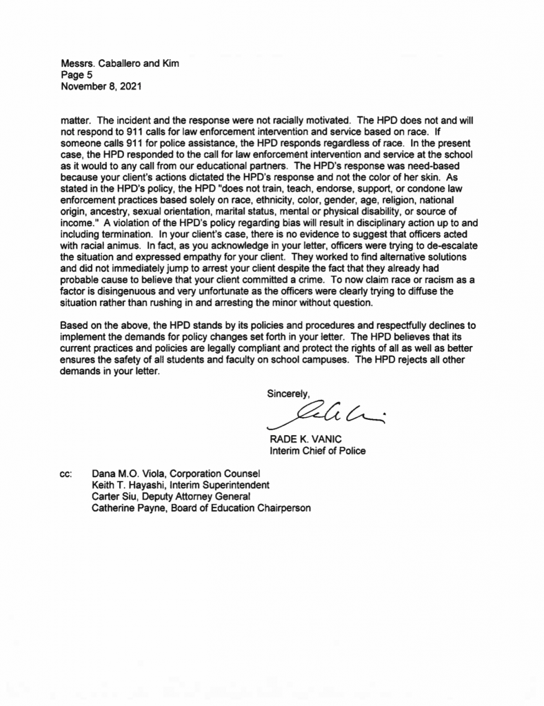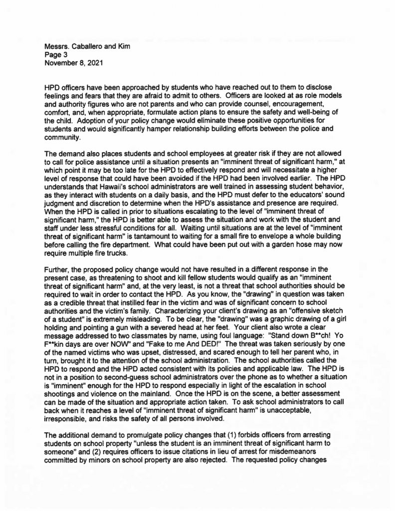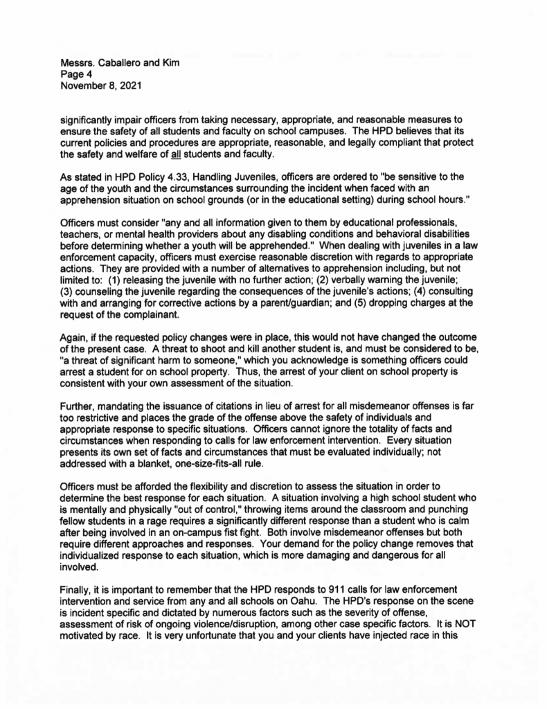Honolulu Police Department spokesperson, Michelle You said, “HPD’s position has not changed as set forth in the November 2021 response to the ACLU Hawaiʻi’s demand letter. Because there is an active, ongoing lawsuit which is being handled by the Department of the Corporation Counsel, HPD will refrain from further comment.”