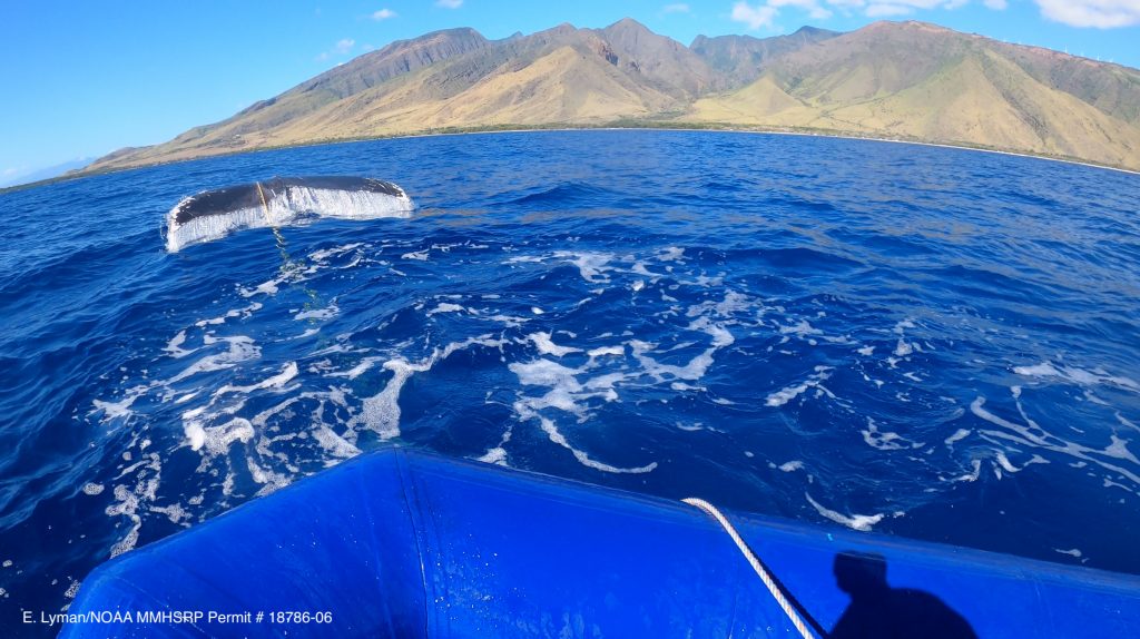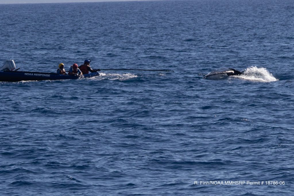 An entangled yearling humpback whale was freed of gear by a NOAA-led team of trained responders off Ukumehame, Maui on Wednesday, Jan. 25, 2022.