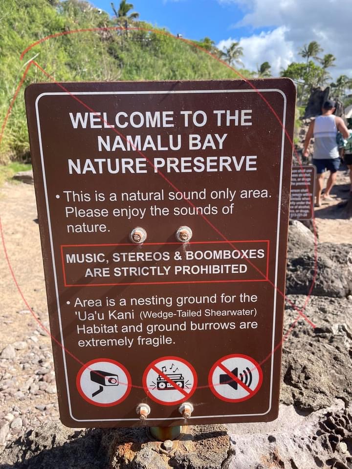Yantis more recently erected signs that refer to “Namalu Bay Nature Preserve” and ask people to enjoy the sounds of nature. It also notifies people about nearby ʻuaʻu kani habitat. “Music, stereos and boomboxes are strictly prohibited,” according to the signs.