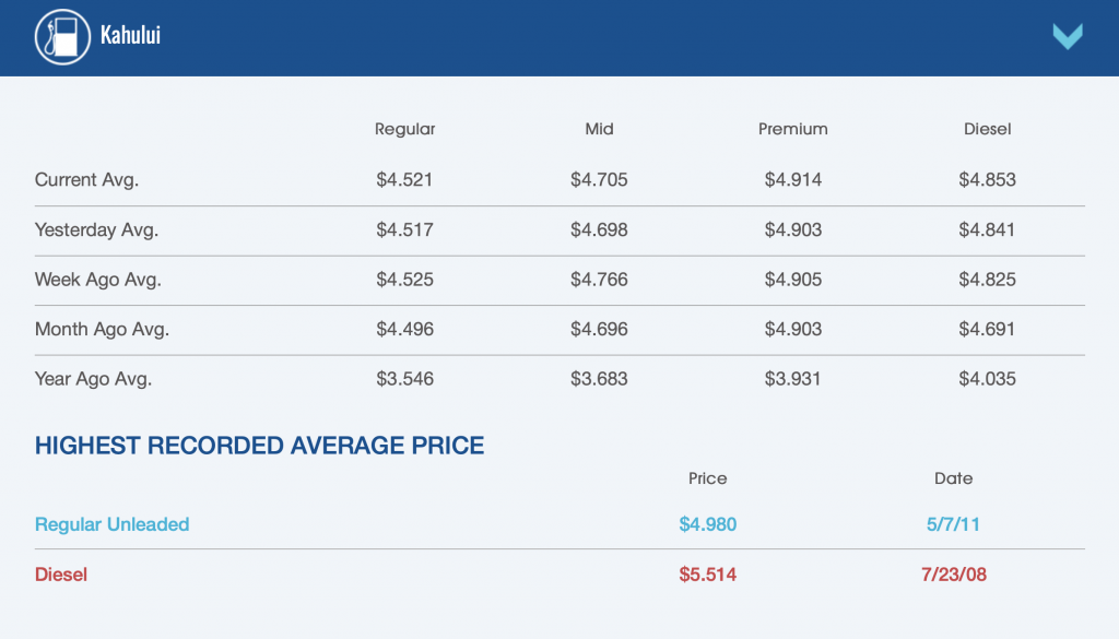 The current average price of regular gas in Kahului and Wailuku is $4.52 a gallon for regular, unchanged from last week, up three cents from a month ago, and up 97 cents from the same time last year, according to average daily prices posted at AAA Hawaiʻi.
