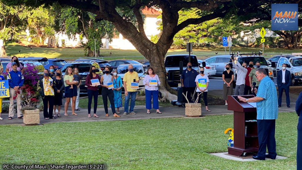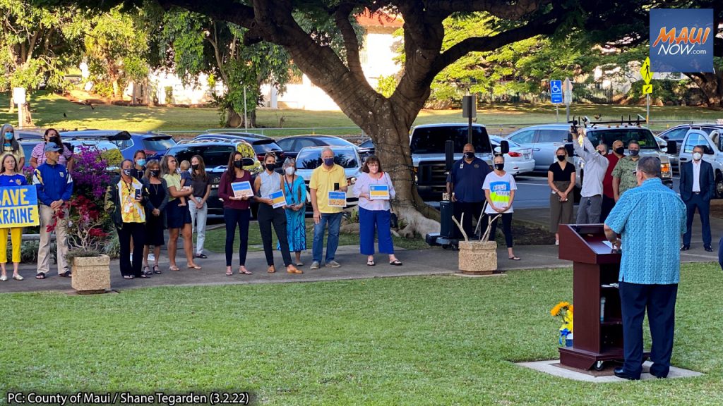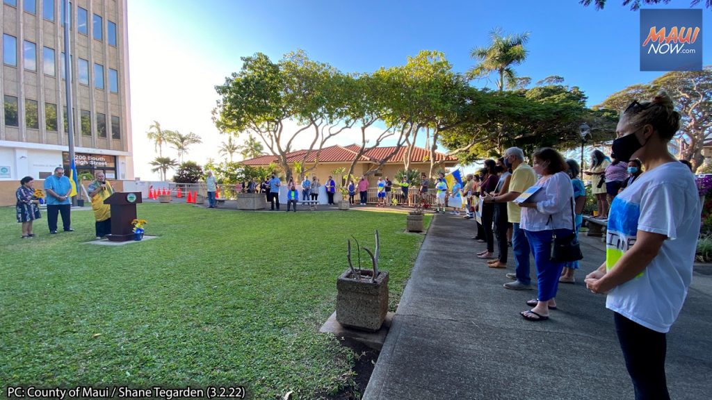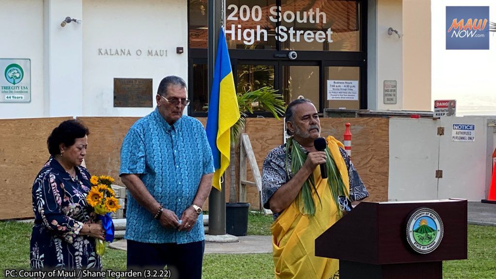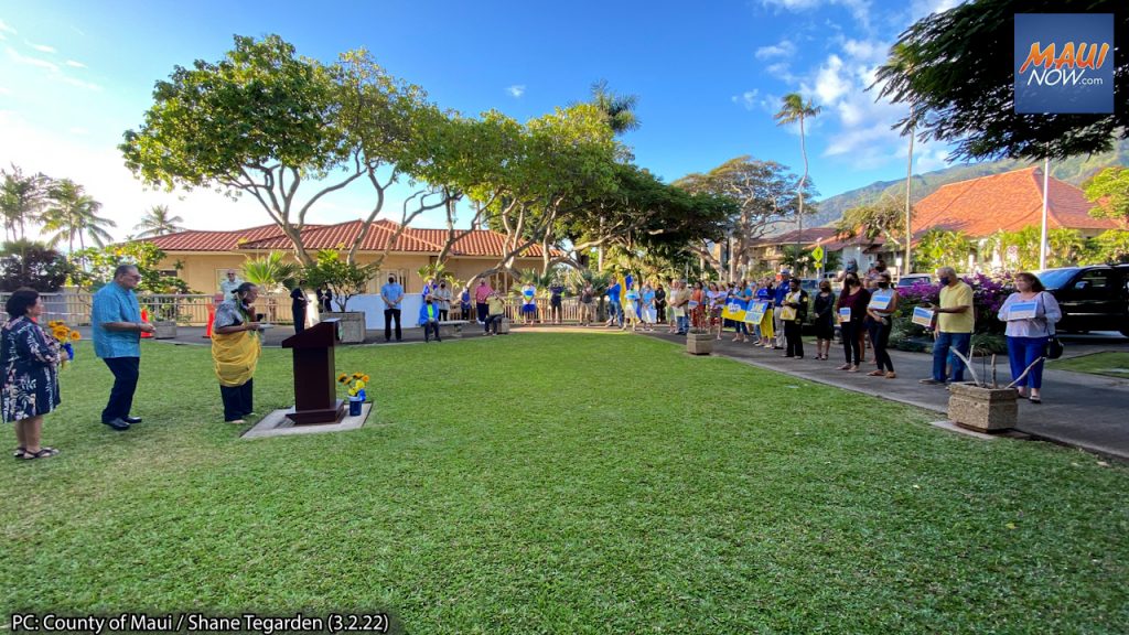 Following a Hawaiian blessing by Kahu Wayne Higa, Mayor Victorino, Maui County Council Chair Alice Lee, Managing Director Sandy Baz, Councilmember Yuki-Lei Sugimura and Maui County First Lady Joycelyn Victorino shared heartfelt messages of empathy and support for the Ukrainian people.