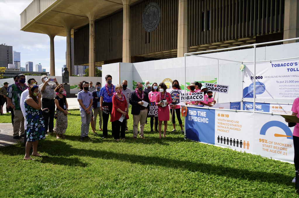 Youth, health advocates, and elected officials gathered at the State Capitol for a press conference to bring awareness to the youth vaping epidemic. Additional sign waving events were organized on Kaua‘i, O‘ahu, Maui, and Hawai‘i Island to build support across the state.