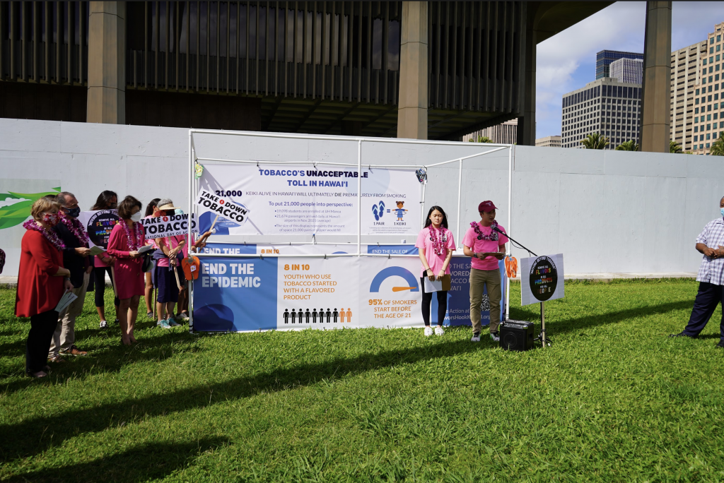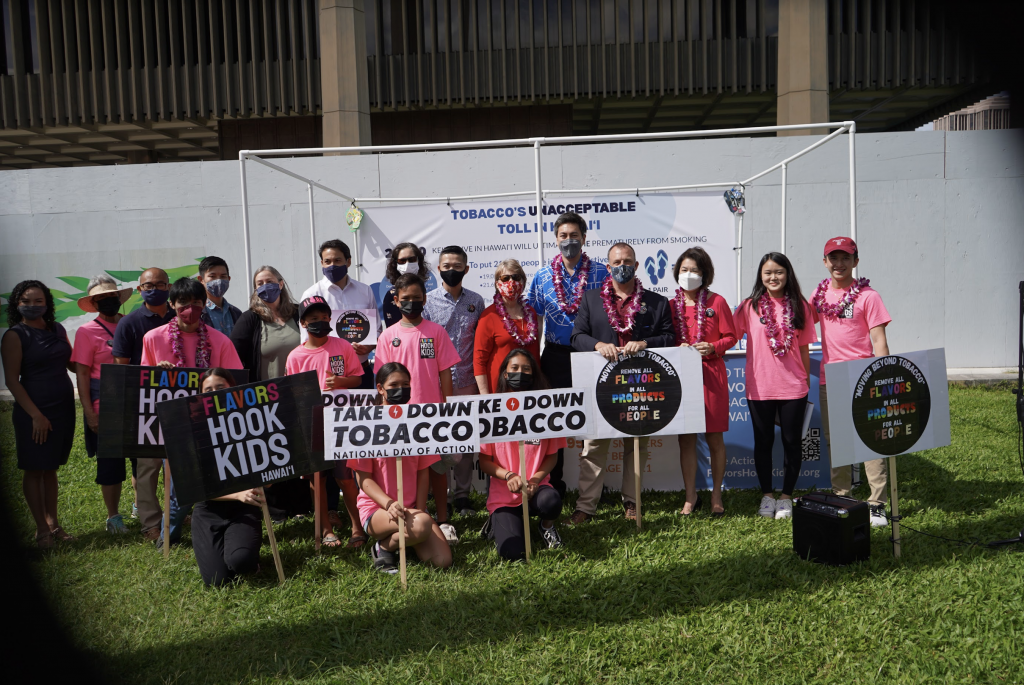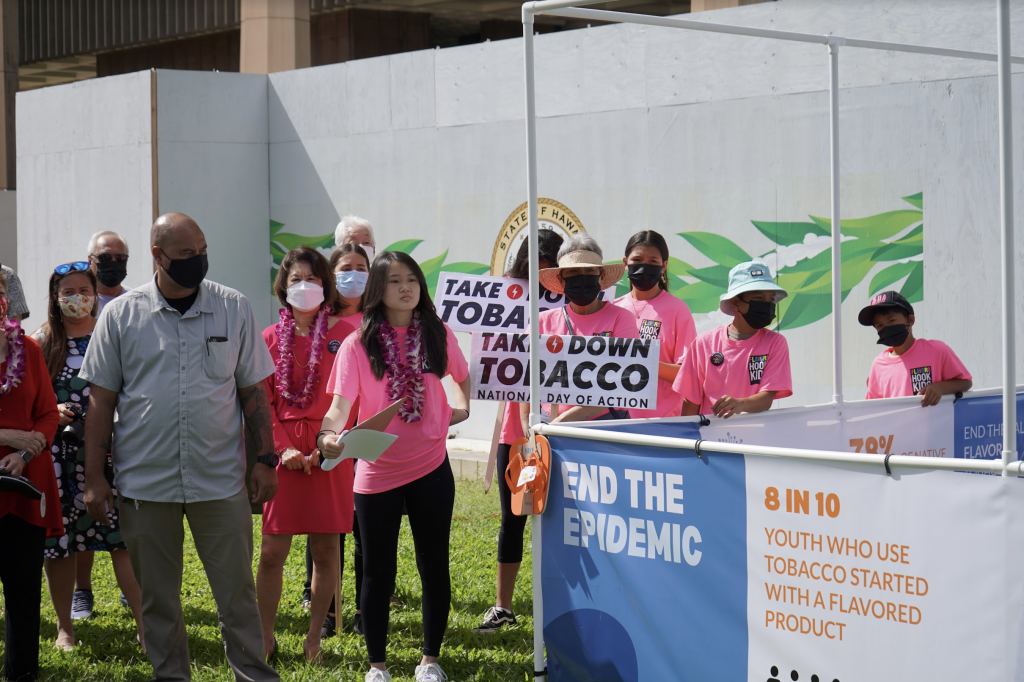 Speakers at the State Capitol included Zoey Duan and Logan Lau of the Coalition for a Tobacco-Free Hawai‘i Youth Council, First Lady Dawn Amano-Ige, Lieutenant Governor Josh Green, Senator Roz Baker of Maui, and Representative Scot Matayoshi.