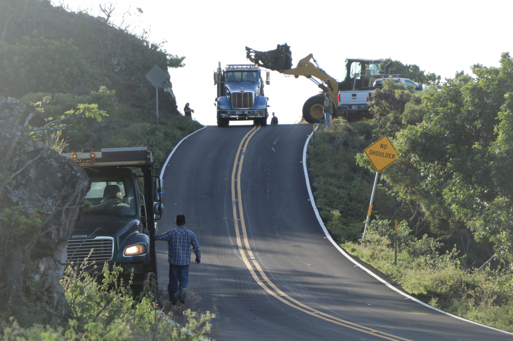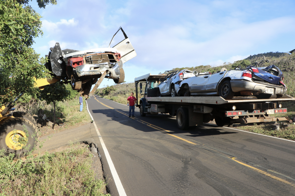 Seven workers from the DOFAW Maui Branch began towing cars and trucks, one at a time, up a steep dirt road on Monday. They managed to “stockpile” 25 of them in an empty area several miles beyond ʻUlupalakua Ranch, next to the highway to stage them for the tow trucks. Crews are using a front-end loader to both crush the cars and to load them onto the flatbeds.