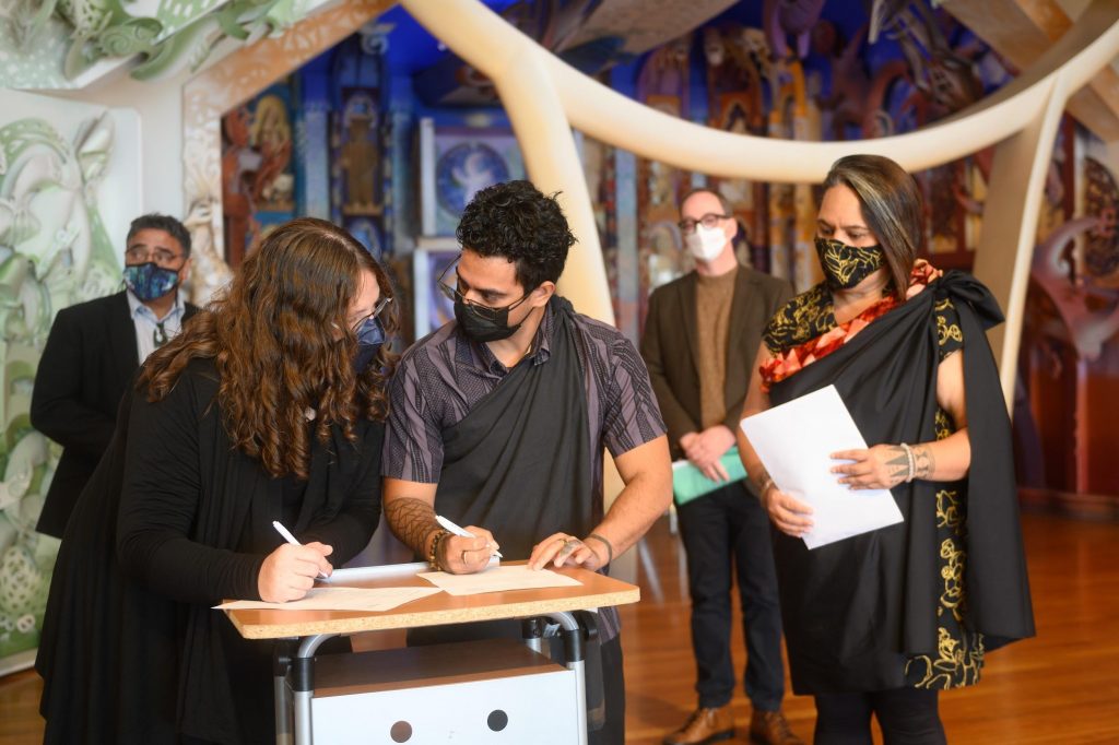 CNHA’s Mehanaokala Hind, along with Makoa Caceres and Kaipo Torco, took part in a traditional Powhiri ceremony at Te Papa Tongarewa Museum of New Zealand in Wellington followed by a formal handover ceremony.