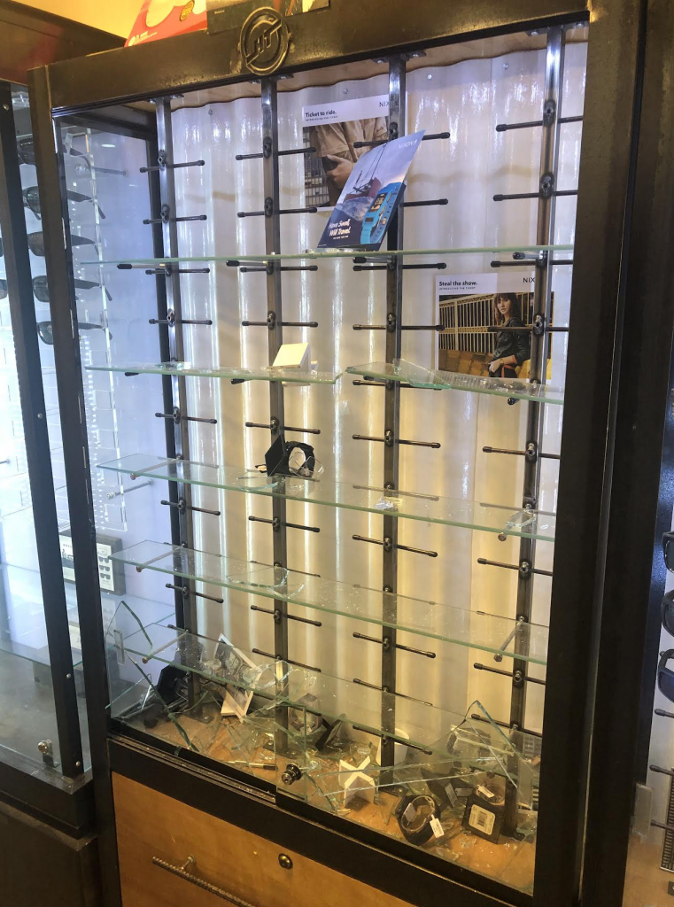 According to the retailer, the suspect went back in and broke the glass on Maui Jim Sunglass case and Nixon Watch case, and loaded the sunglasses and watches into a trash can. “He cleaned out the cases,” Ball reported.