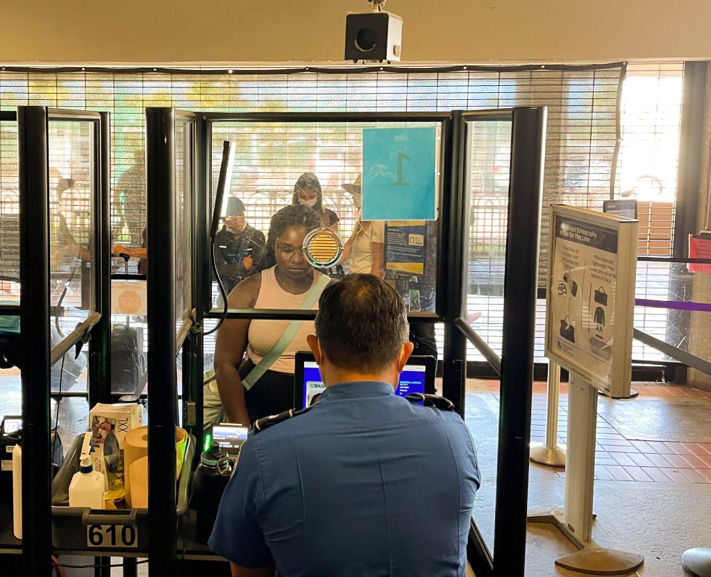 Two computed tomography scanners screen carry-on luggage by generating a 3D image of contents. When using the scanner, travelers can leave everything in bags, including electronics larger than a cell phone and food.