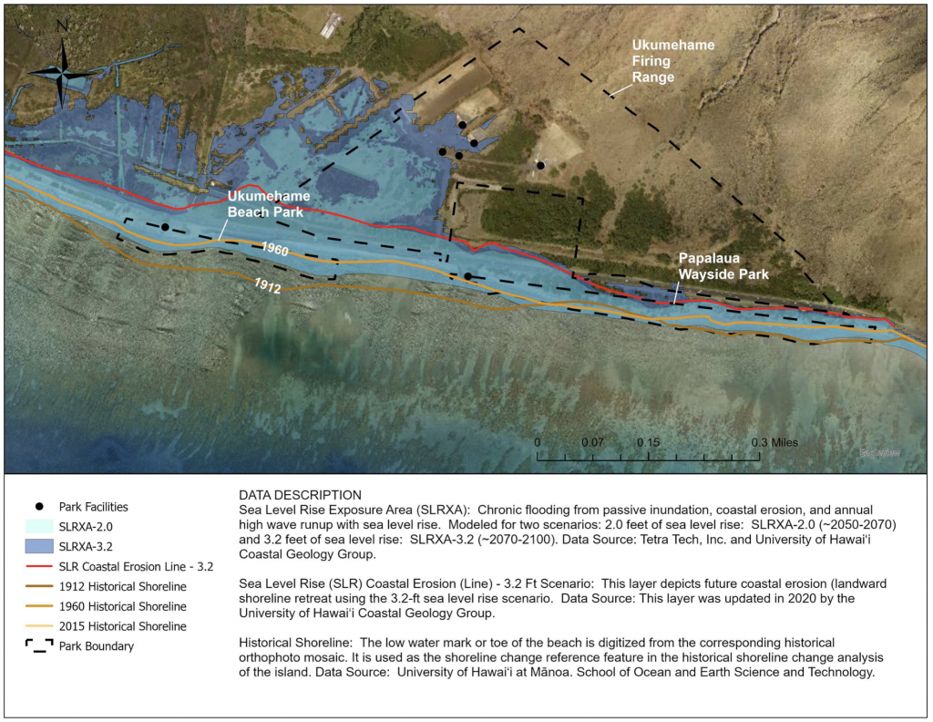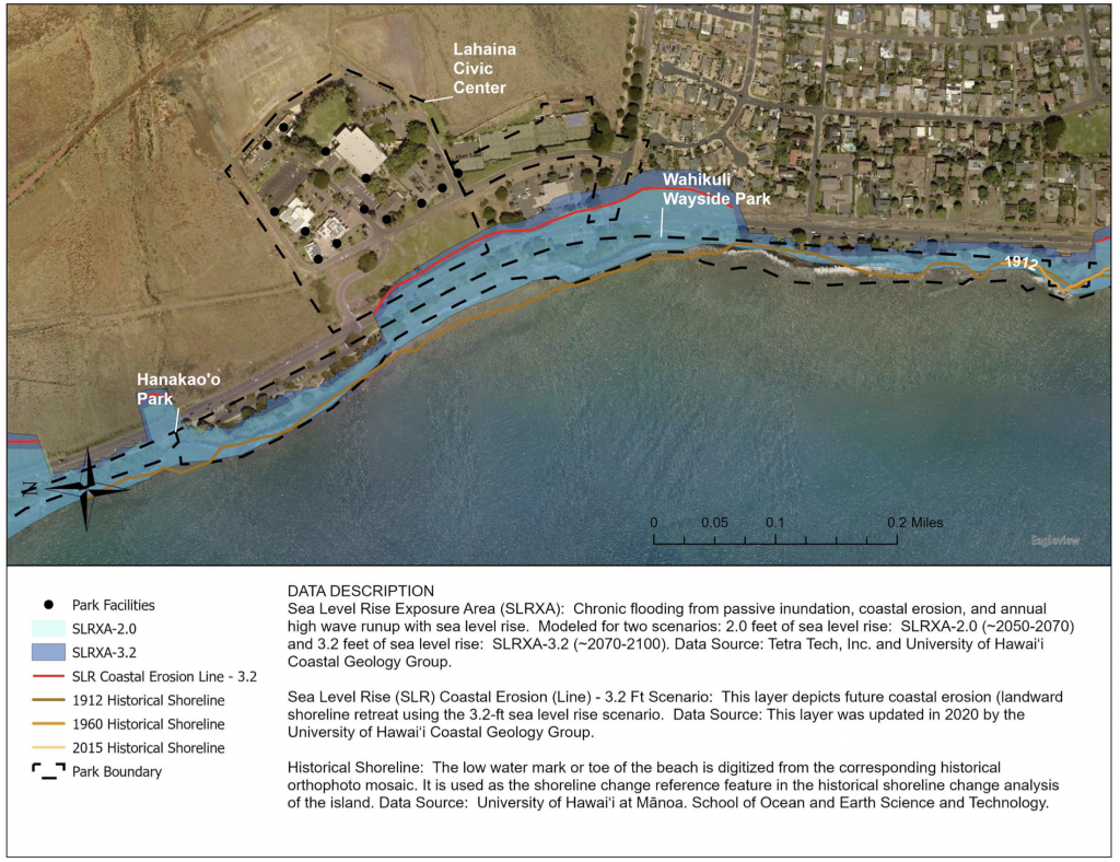 Three beach parks in West Maui–Launiupoko, Ukumehame, and Wahikuli Wayside Park–had the lowest adaptation potential to withstand impacts of sea level rise, based on five indicators of vulnerability.