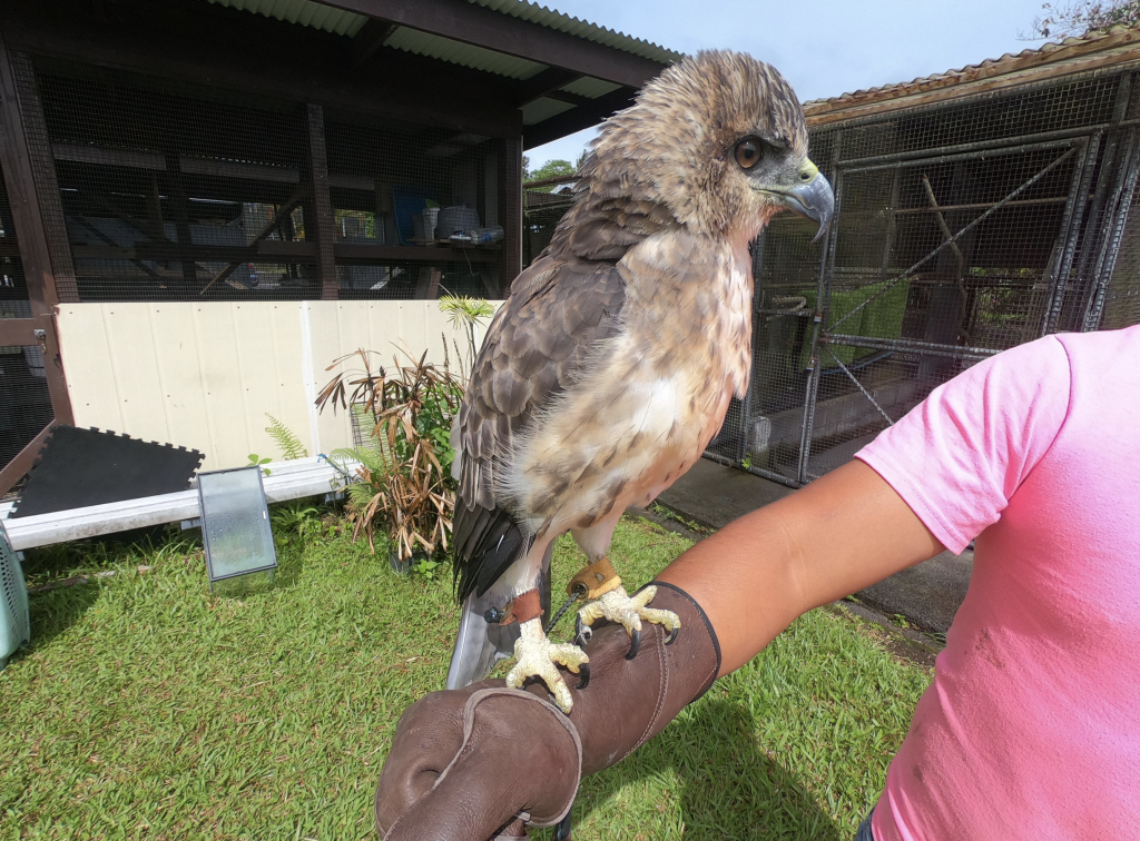 The three-year-old male bird came to the center in 2019 and is under the care of veterinarian Dr. Juan Guerra and his team. “His main problems were an eye injury and a soft-tissue wing injury,” Guerra said while putting Maka‘io through a daily series of exercises to keep him healthy. “His wing injury healed fine, but he can’t see out of his right eye anymore. As a birds of prey, ‘Io don’t do well out in the wild if they’re unable to see with both eyes.”