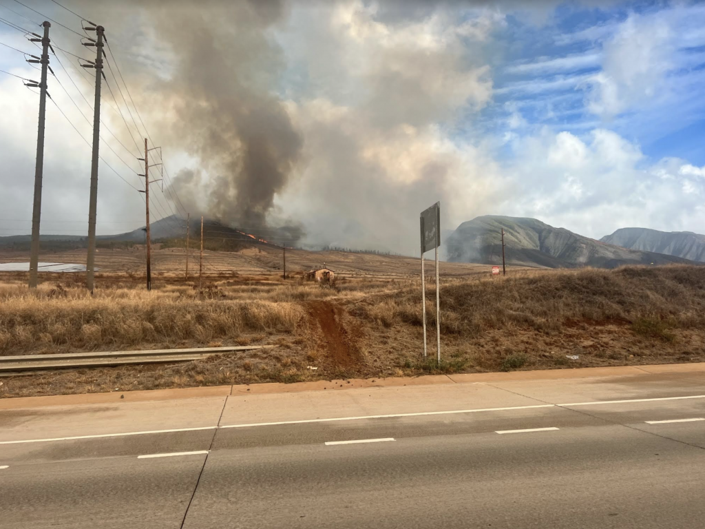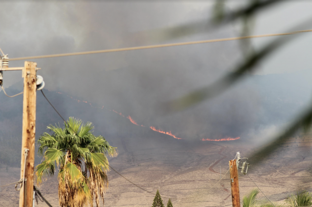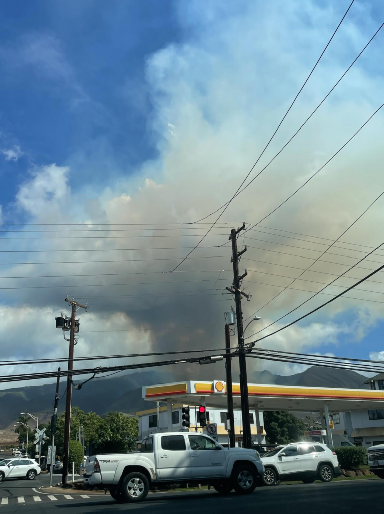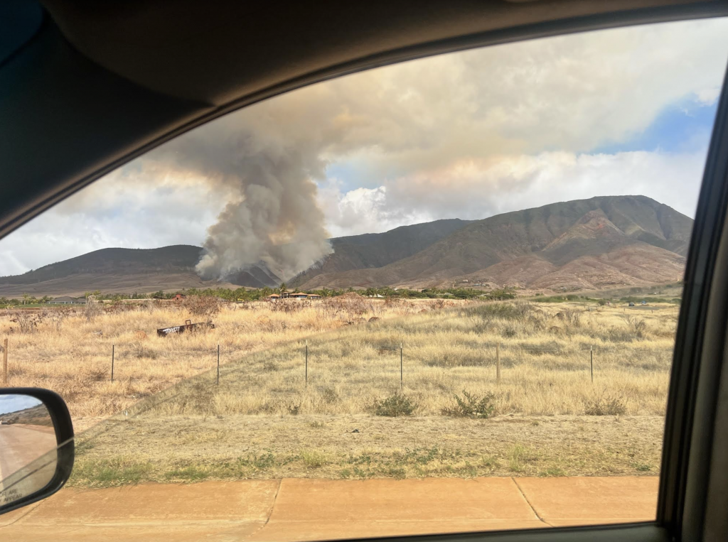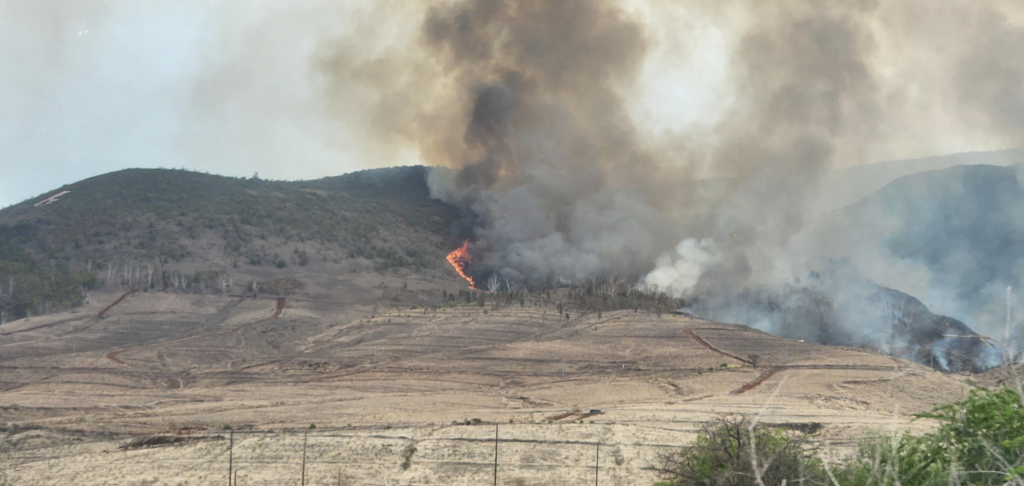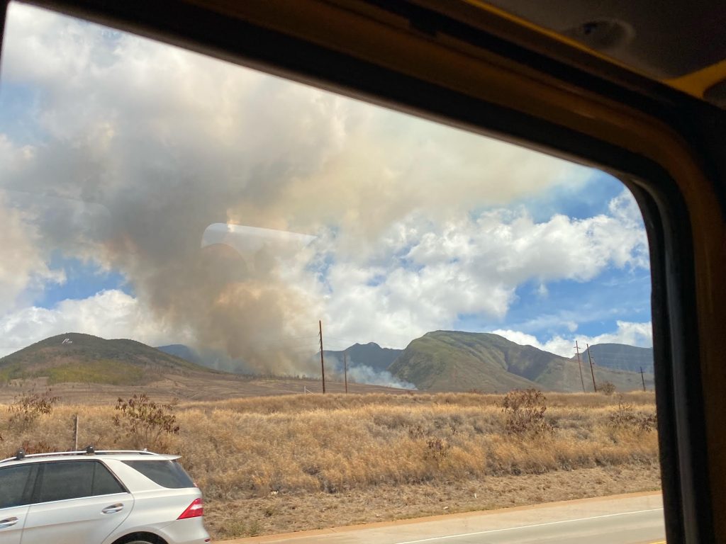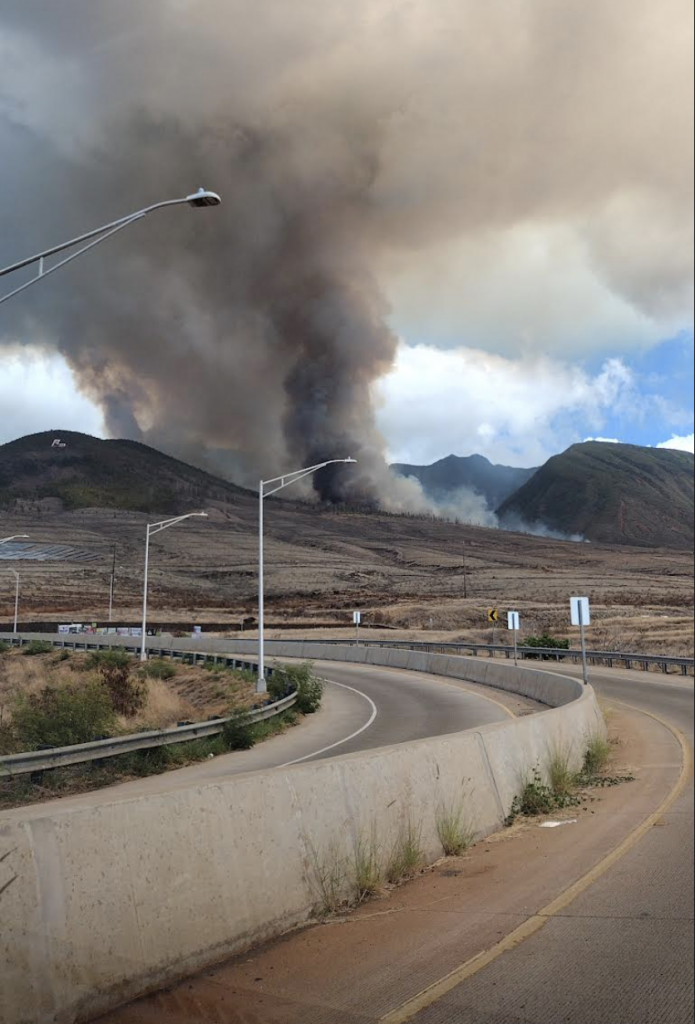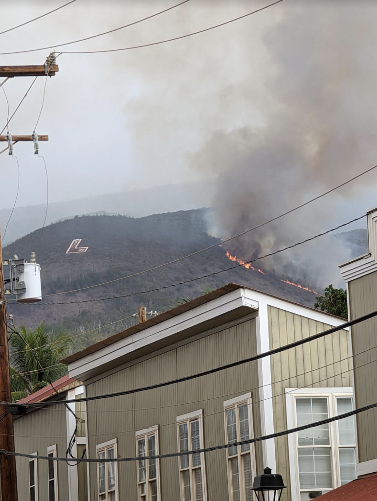 Kauaula fire (11.8.22) spreading toward Lahainaluna. View from Tamura’s parking lot. PC: Rosa McAllister