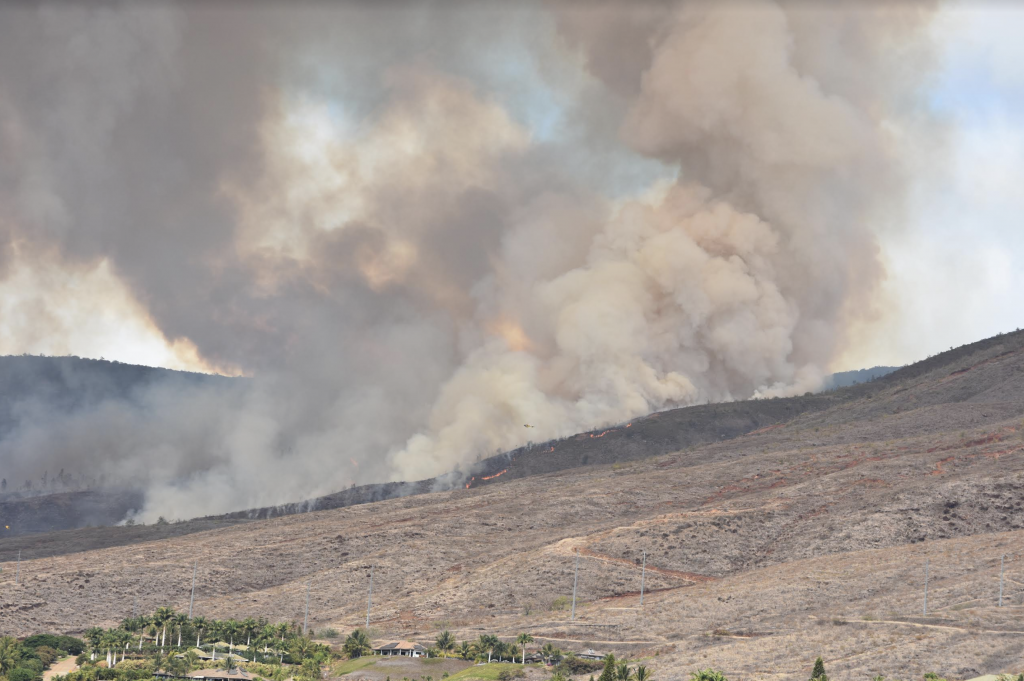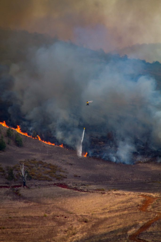 Three Maui Fire Department helicopters conducted water drops throughout the day, but were grounded later because of darkness.