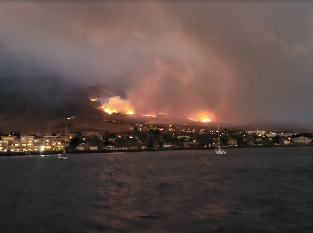 West Maui fire, vantage from Lahaina Harbor at 6:28 p.m., Nov. 8, 2022. PC: Nicole Bouchard