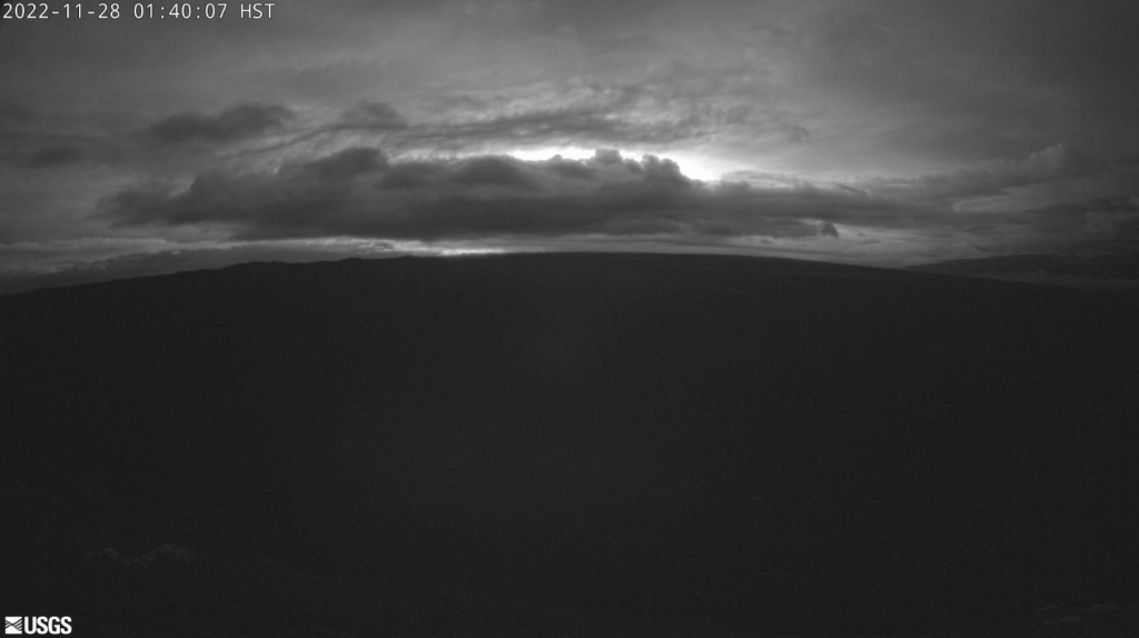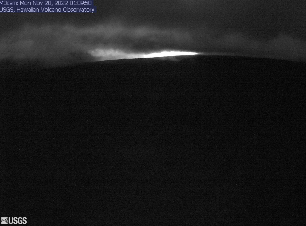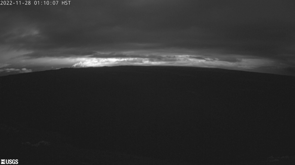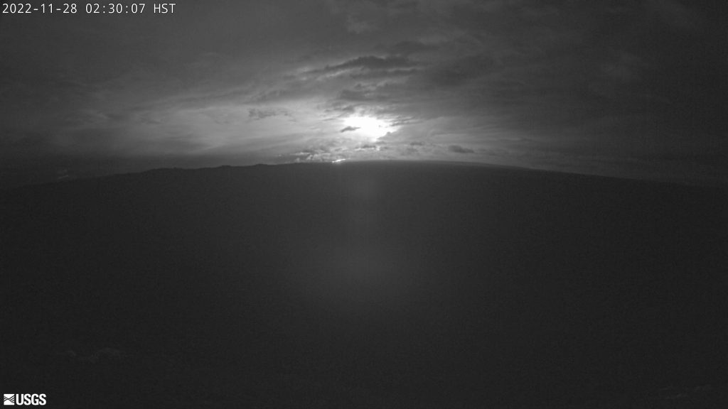 The eruption continues at the summit of Mauna Loa. “All vents remain restricted to the summit area. However, lava flows in the summit region are visible from Kona. There is currently no indication of any migration of the eruption into a rift zone,” according to a status update issued by the USGS Hawaiian Volcano Observatory. Hawai‘i Volcanoes National Park has closed the Mauna Loa summit area to visitors.