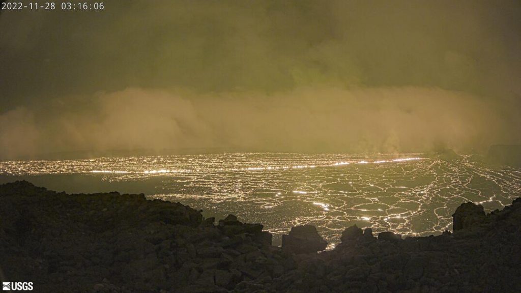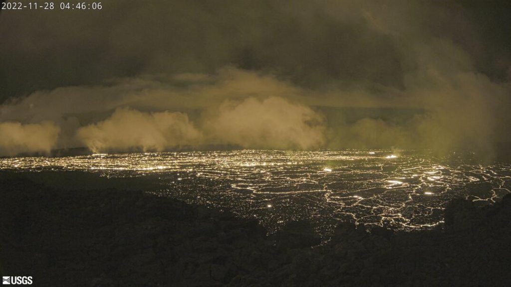 The Hawaiʻi Emergency Management Agency issued an update at around 1:11 a.m. saying, “At this time, the lava is confined to the immediate area of the mountain’s summit, and has not begun flowing outside that area. No communities downslope from the caldera are immediately threatened, and about half of all recorded Mauna Loa eruptions have been confined to the summit area.”