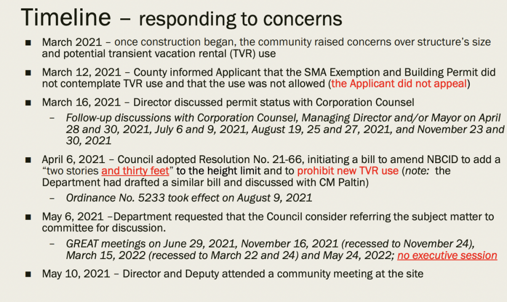 “There is not a single citizen of our community that looks at this building every day and thinks that it’s compliant with the law,” Josh Downer of Nāpili Bay Community Association testified during the council’s Planning and Sustainable Land Use Committee meeting Thursday. “If this council will not follow through on the investigation and provide an independent legal analysis to our questions, then we will have to get a court to do so.”