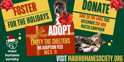 The public is invited to make a positive impact on Maui’s animal community by becoming a “Foster for the Holidays.”