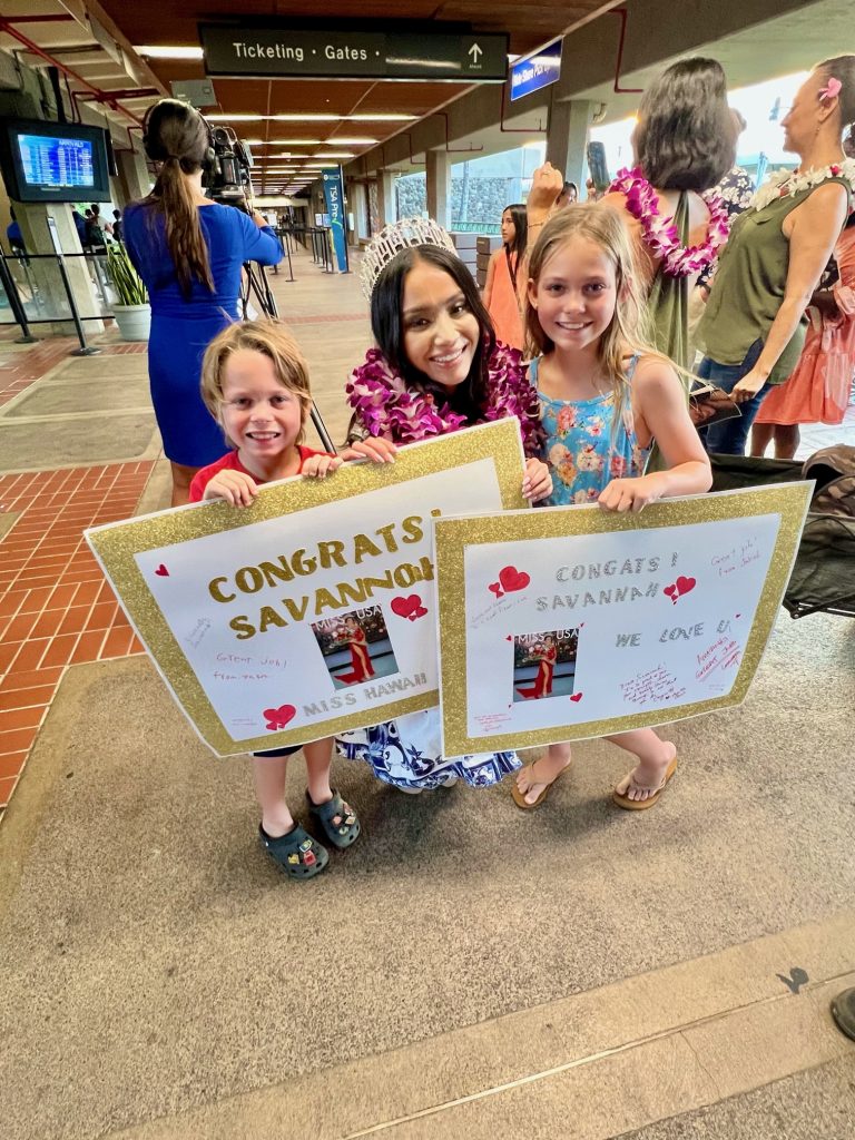 Maui’s Savannah Gankiewicz returned to a homecoming celebration at Kahului Airport on Tuesday evening after earning the coveted Miss Hawaii USA crown over the weekend.