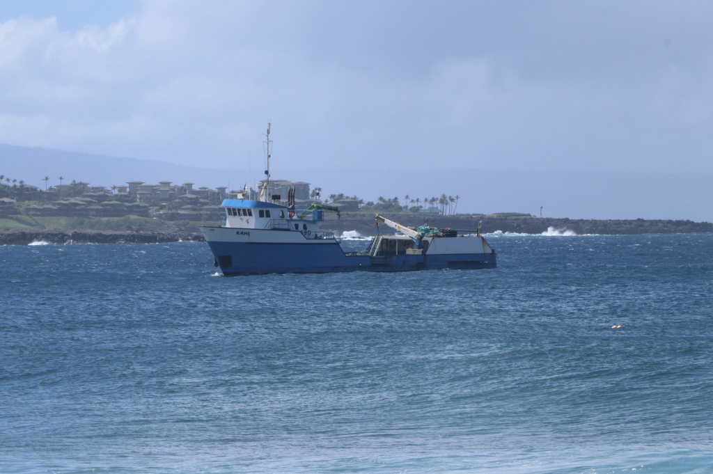 DLNR Division of Conservation and Resources Enforcement officers are continuing to staff a roadblock at the top of the dirt road leading into Līpoa Point to ensure community safety until the salvage operation is finished.
