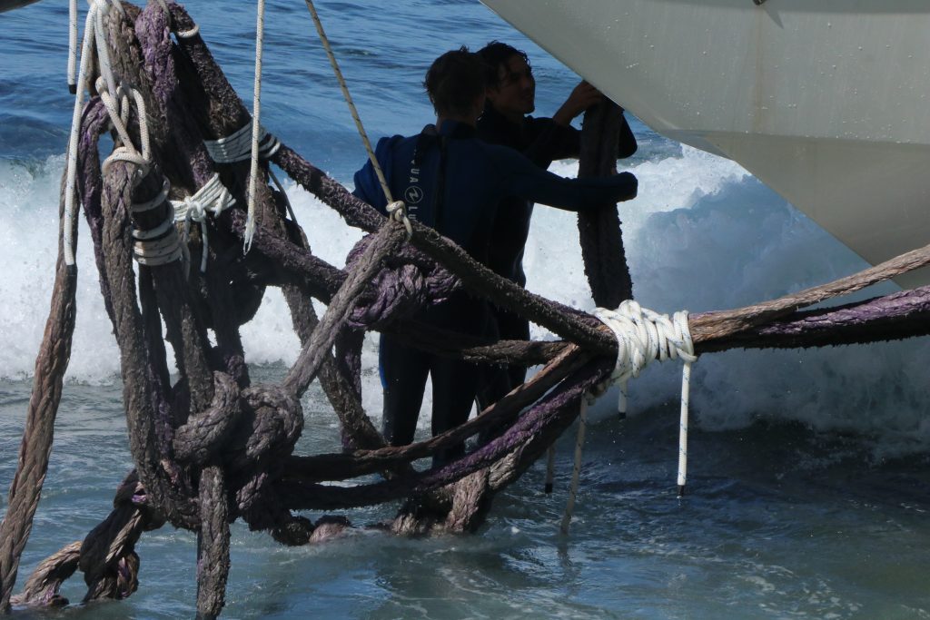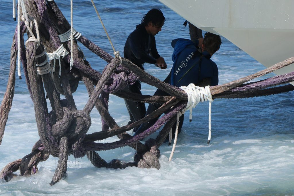 A rigging crew from the Kahi worked all day Saturday and again this morning securing rigging to the yacht, which will be attached to the tug sometime during high tide, in hopes of freeing the vessel.