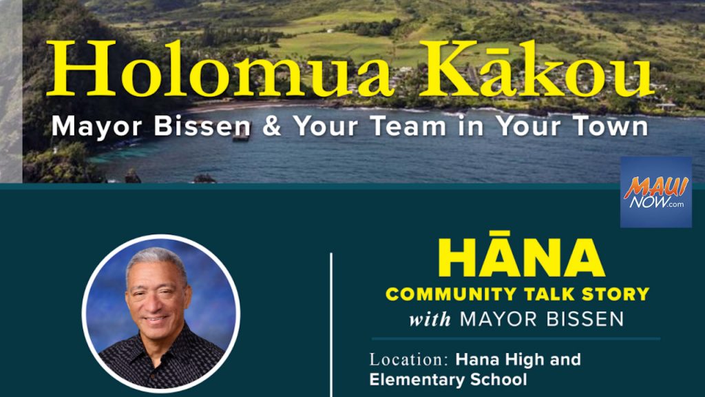 On Thursday evening, Mayor Bissen will host a community talk story from 5:30 to 7:30 p.m. at Hāna High and Elementary School.
