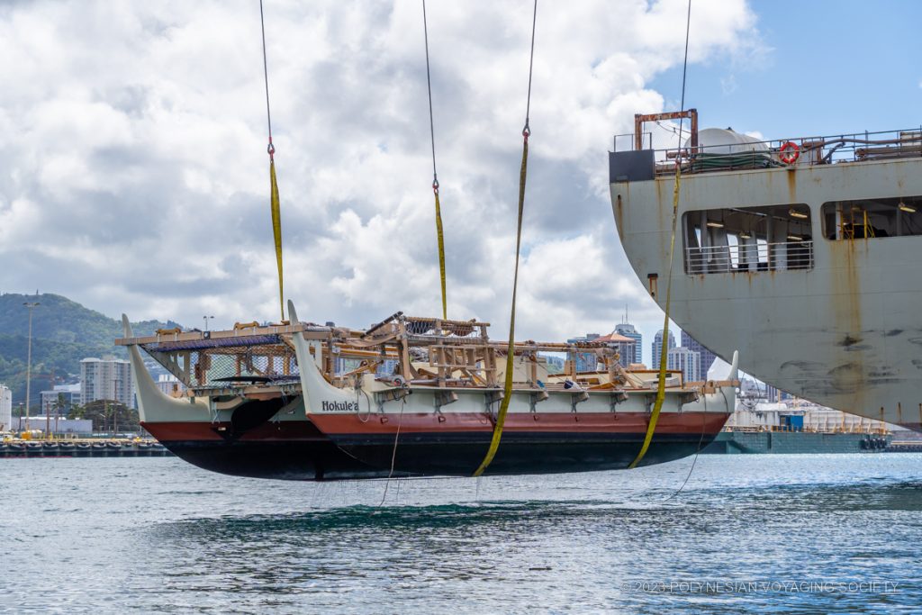 Hōkūleʻa was successfully lifted and loaded onto the R. J. Pfeiffer container ship at Honolulu Harbor’s Pier 52 on Sunday. The Matson ship departed later that afternoon and is now enroute to Tacoma, Washington where it is scheduled to arrive on April 21, 2023. Longtime PVS sponsor Matson donated $94,000 in services for the transport of Hōkūleʻa to Tacoma.