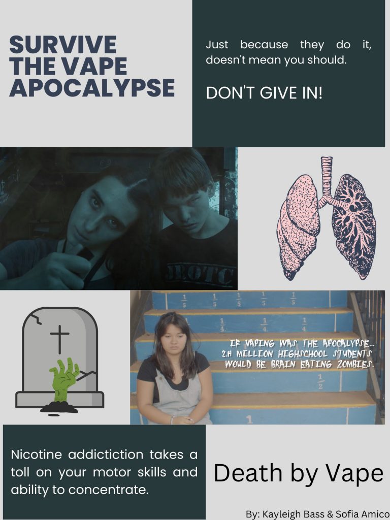 Kayleigh Bass of Kihei Charter used the “Survive the Vape Apocalypse” theme in her PSA video parody of vaping and zombies and informational flyer. “If Vaping Was The Apocalypse, 2.14 Million High School Students Would Be Brain Eating Zombies,” her video and flyer said.