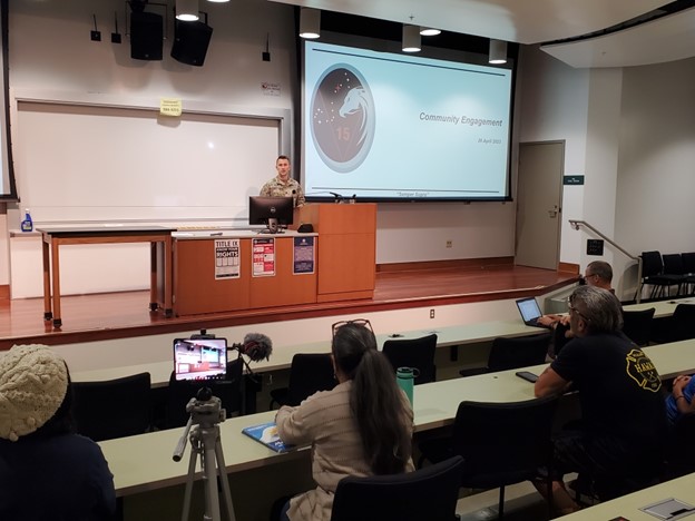 • US Space Force Lt. Col. Phillip Wagenbach, 15th Space Surveillance Squadron commander, speaks during a community forum at the University of Hawaiʻi Maui College in Hawaiʻi on April 26, 2023. The purpose of the forum was to provide an update on the current status of remediation efforts at the Maui Space Surveillance Complex. PC: US Space Forces Indo-Pacific