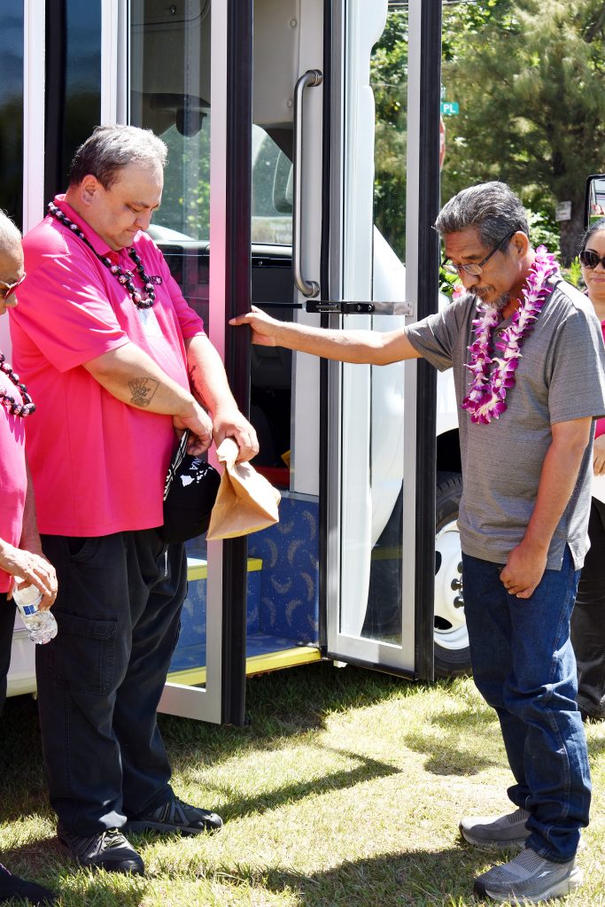 The $155,000 bus, funded by the county, was blessed by Kahu John Kahalehoe at “Stonewall Square” in the center of Hāna town. He also blessed the drivers – Mary “Kaui” Brook, also MEO Hāna Branch Manager; Karen Redo; Viola Diego; Tuks Medeiros and Lani Kawaiaea.