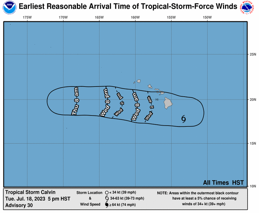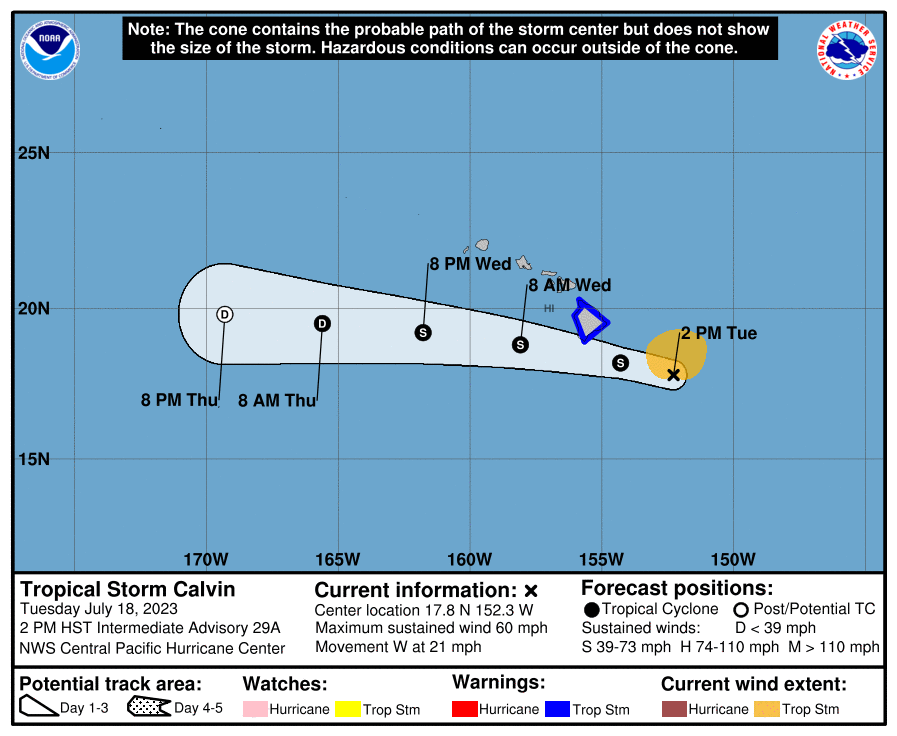 The National Weather Service reports the center of Tropical Storm Calvin is forecast to pass nearby just south of the Big Island of Hawaiʻi tonight and early Wednesday, then pass “well south” of the other Hawaiian Islands through Wednesday night.