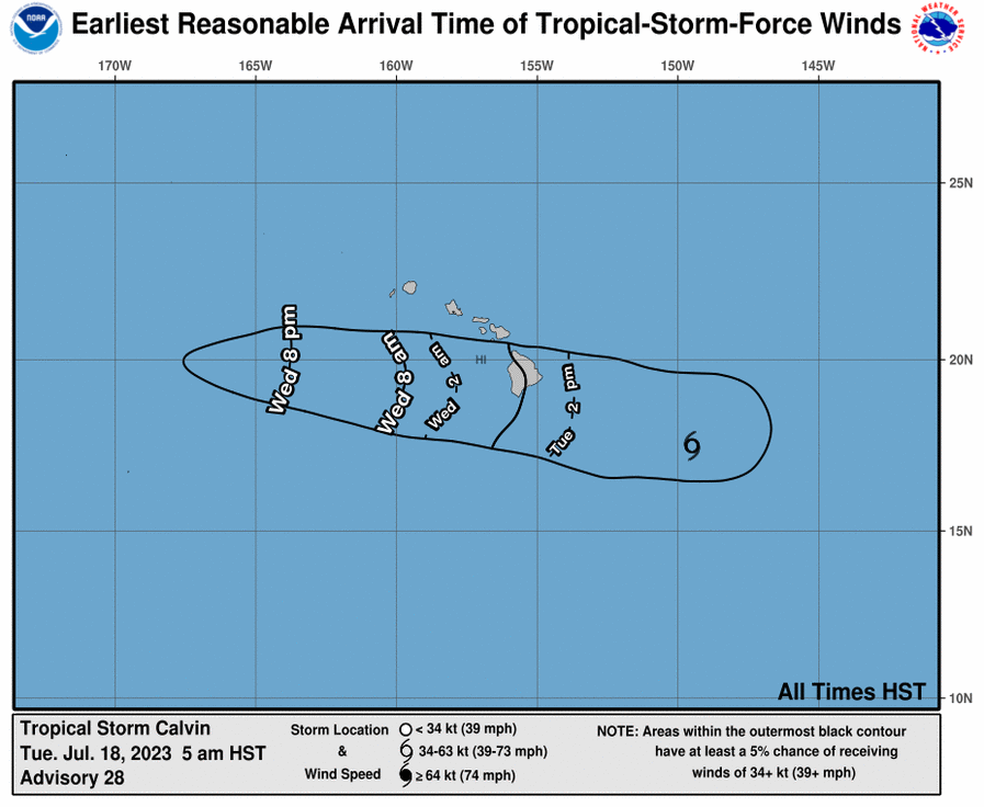 - WIND: Tropical storm conditions are expected within the warning area starting this evening. Preparations for tropical storm force wind impacts should already be completed for persons in Hawaiʻi County. The National Weather Service reports: “Locally strong winds will begin this evening over the Big Island, with north winds shifting to the northeast and east as Calvin moves westward through Wednesday morning. Winds will primarily be northeasterly over the smaller islands, strongest Wednesday and Wednesday evening. It is important to note that the mountainous terrain of the islands can produce localized areas of enhanced winds, even well away from the tropical cyclone center.”