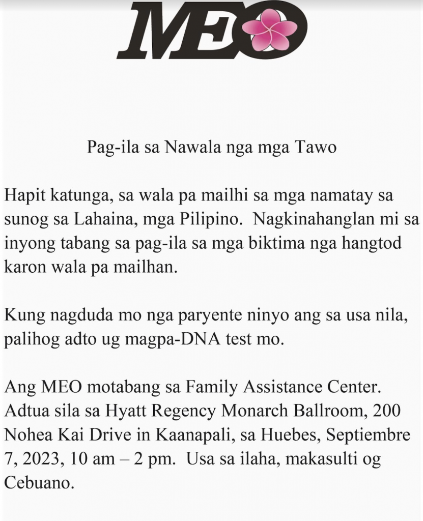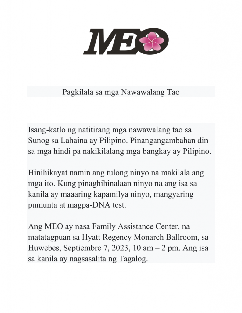 Spanish- and Filipino-speaking individuals seeking to report missing people from the Lahaina wildfire can receive assistance from Maui Economic Opportunity language specialists from 10 a.m. to 2 p.m. Thursday.