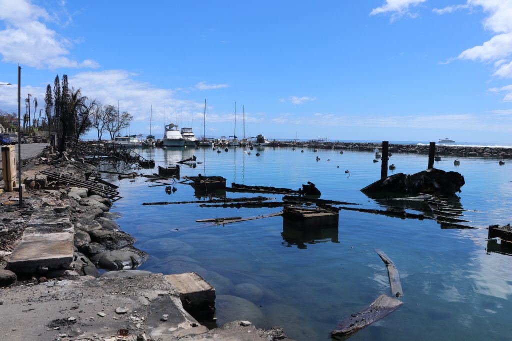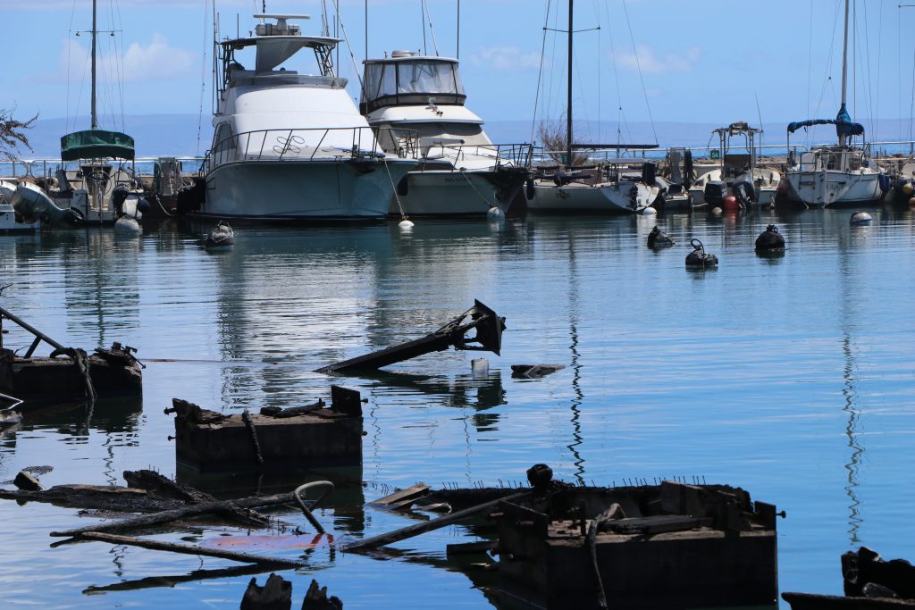 “Most of the 13 boats, as well as the pier they’re tied to, appear to be largely untouched by the flames of Aug. 8,” according to a state Department of Land and Natural Resources news release. “One boat, the Reel Luckey, the last name of its owners, is a metaphor for the line of white vessels, still afloat in stark contrast to the blackened landscape, buildings, and harbor structures.”
