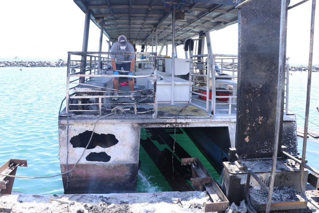 The stern of the 55-foot-long Holokai was scorched but Walsh said, “We’re happy to see her. When I saw the condition the engine room was in, it was perfect, nothing the matter with it at all. Once I saw that I said, ‘Man we’ve got a good chance here.’ Sure enough she fired up just like that.”