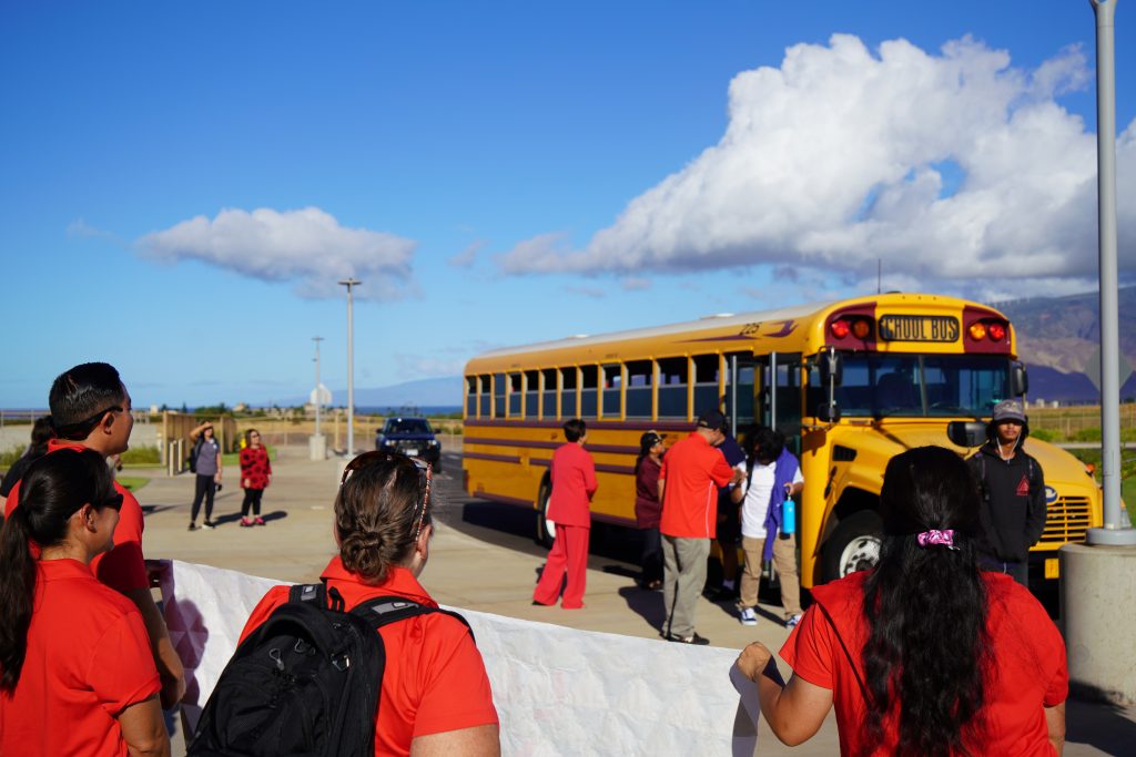 Lahainaluna students were welcomed by Kūlanihākoʻi students and staff cheering and waving signs at the drop-off area on campus.